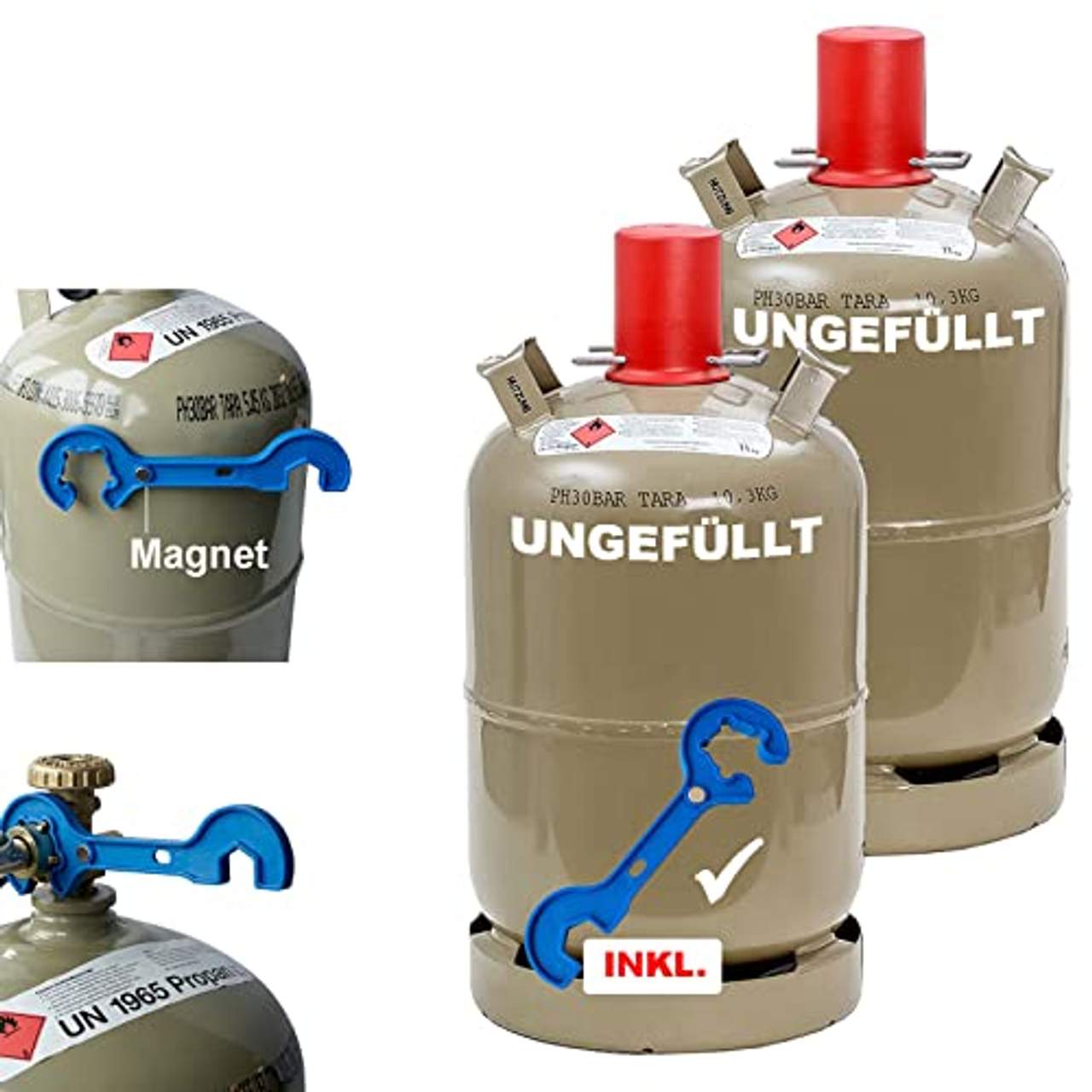 CAGO 2 x Camping Propan-Gas-Flasche 11kg grau leer Neuflasche2x Propan-Gasflasche 11 kg grau inkl. Gasreglerlöser mit Magnet + Schlüssel 17 mmAnwendungen:Für Ihren Gasgrill, Campingkocher, Gas Kühlschrank, Gas Strahler, Gasheizofen / Gas-Heizgebläse, Wohnwagen, Reisemobil und Kleingarten.Flasche:Schulterfarbe: olivgrau RAL 7002Körperfarbe: olivgrau RAL 7002UNGEFÜLLT/LEERBei dieser Flasche handelt es sich um eine Eigentumsflasche die Sie leer gegen voll an jeder Tauschstelle (Baumarkt, Tankstelle, Campingplatz, Campingfachgeschäft) tauschen können.CAGO Gasregler- und Schlauch-Schlüssel mit Magnet:Dieser Gasflaschen-Schlüssel ermöglicht Ihnen ein kraftsparendes Anschließen und Lösen von Kleinflaschenreglern an dem Gasflaschenventil sowie auch gleichzeitig das Anschließen und Lösen des Gasschlauchs mit einer Überwurfmutter 1/4’'. Dazu gewährt der Schlüssel durch den integrierten Magnet einen sicheren Halt an handelsüblichen Stahlflaschen.Gasflaschen-Schlüssel:Maße: Maße: B 50 mm x L 166 mm x H 7 mmMaterial: KunststoffFarbe: BlauGewicht: 0,023