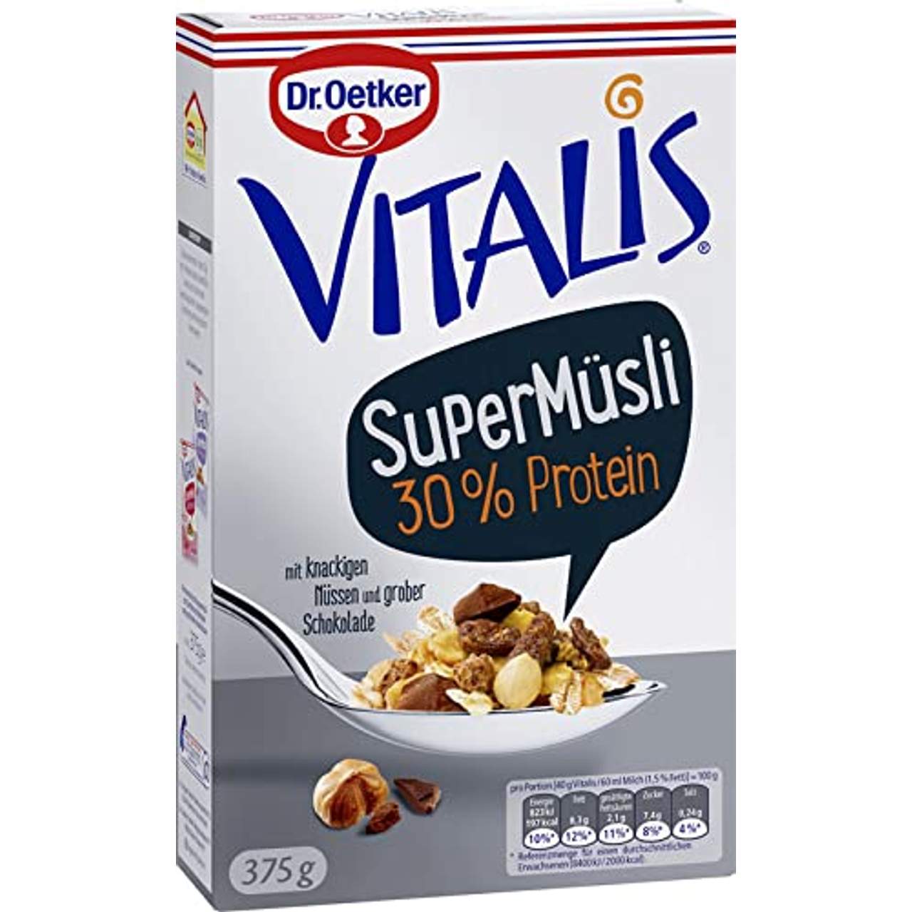 Dr. Oetker Vitalis SuperMüsli ist ein eiweißreiches Müsli aus Vollkornhafer, Roggen- und Sojaflocken, Zartbitterschokoladenstückchen und Haselnüssen. Es enthält 30% Eiweiß und ist damit ideal für alle, die Muskeln aufbauen wollen. Die knusprige Konsistenz gepaart mit der herben Schokolade und den Nüssen machen es sowohl nahrhaft als auch lecker.