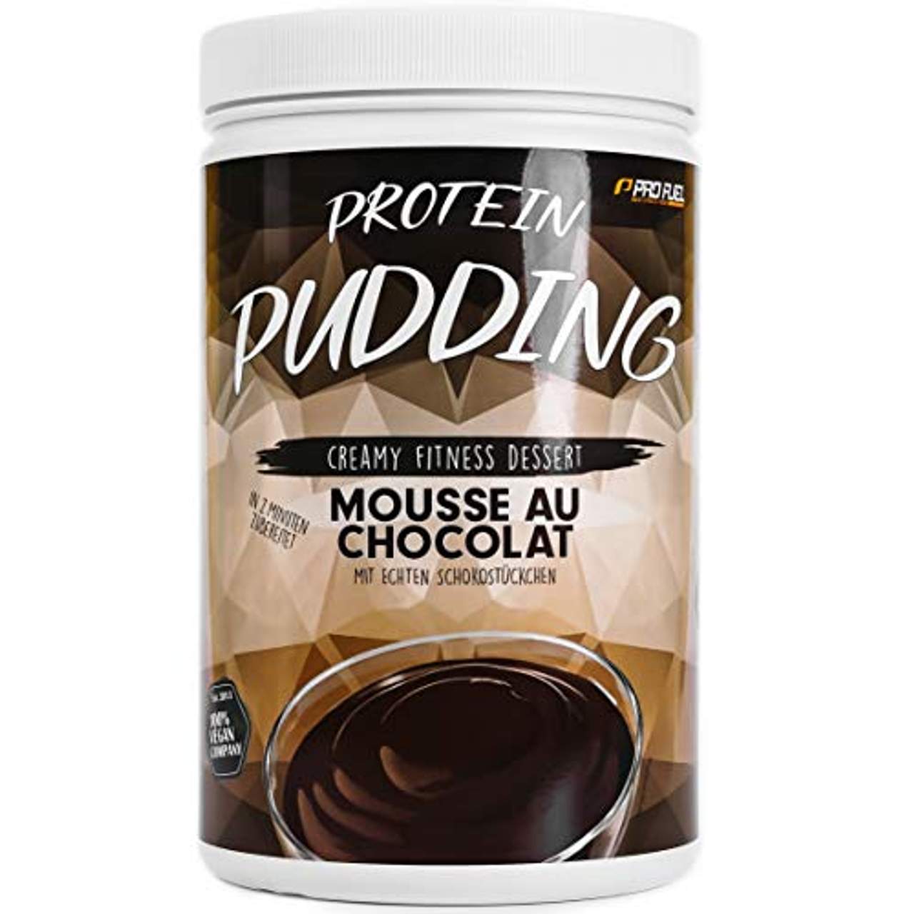 ProFuel Veganer Protein PuddingProtein Pudding - vegan, lecker, proteinreich und in 2 Minuten zubereitet Köstlicher Geschmack Hoher Proteingehalt In 2 Minuten zubereitet Nur 111 kcal pro Portion Low fat & low sugar 100% vegan Made in Germany Laktosefrei Ohne küsntliche Farb- und Füllstoffe Ballaststoffreich Mit Stevia gesüßt Der ProFuel Protein Pudding ist eine außergewöhnlich leckere Süßigkeit, mit optimalen Nährwerten und einer extra grossen Portion Protein.Als High-Protein-Dessert vorsorgt Dich der cremige Protein-Pudding mit hochwertigem pflanzlichen Eiweiß und enthält dabei 60% weniger Kalorien als ein normaler Pudding. Egal ob als Nachtisch, nach dem Sport oder einfach zwischendurch - gib Deinem Körper die Extra-Portion Protein und genieße gleichzeitig einen köstlichen veganen Protein-Pudding. Der Protein Pudding hat einen hohen Protein-Gehalt (67%) und liefert satte 19,9 Gramm pflanzliches Eiweiß pro Portion. Zudem ist der Protein-Pudding ballaststoffreich (bis zu 2,4 Gramm / Portion) und sorgt dadurch für ein gutes Sättigungsgefühl. Mit gerade einmal 1,1 Gramm Fett und 1,0 Gramm Zucker ist dieses Protein-Dessert sowohl fettarm (low fat) als auch zuckerarm (low sugar). Im Vergleich zu klassischem Pudding hat der ProFuel Protein Pudding mit lediglich 111 kcal pro Portion ca. 60% weniger Kalorien und ist damit für eine figurbewusste Ernährung optimal geeignet.Protein Pudding mit unglaublich leckerem Geschmack ProFuels Anspruch war es einen veganen Protein-Pudding mit optimalen Nährwerten und einem köstlichen Geschmack zu entwickeln und der darüber hinaus auch noch kinderleicht und schnell zubereitet ist - sie haben es geschafft: Mit dem ProFuel Protein-Pudding-Pulver zauberst Du im Handumdrehen ein unglaublich leckeres und cremiges Protein-Dessert - die perfekte Alternative zu einem klassischen Pudding. Du kannst das Protein-Pudding-Pulver zum einen kaloriensparend mit Wasser anmischen oder mit einer leckeren Pflanzenmilch Deiner Wahl. Mit der Variante Mousse au Chocolat mit echten Schokostückchen kommt jeder Schokoladenfan auf seine kosten - ein Leckerbissen! Protein Pudding mit der Extra-Portion Eiweiß Der Protein Pudding schmeckt nicht nur unglaublich lecker, sondern ist auch eine wahre Eiweiß-Bombe. Im Vergleich zu einem herkömmlichen Pudding aus dem Supermarktregal enthält das ProFuel Protein-Pudding-Pulver 6-7 mal mehr Eiweiß.Eine Portion Protein Pudding liefert rund 20 Gramm Protein pro Portion und damit so viel wie ein guter Protein-Riegel oder eine Packung Protein-Chips. Um schnellstmöglich Muskeln aufzubauen, benötigt Dein Körper eine optimale Versorgung mit Protein - idealerweise gleichmäßig über den Tag verteilt. Ist eine Mahlzeit sehr kohlenhydratreich und gleichzeitig proteinarm (wie z.B. bei Nudeln mit Tomatensauce), isst Du einfach als Dessert einen leckeren Protein Pudding und gleichst damit das fehlende Eiweiß aus.Und wenn Du mal wieder einen Heißhunger auf etwas Süßes hast, genieße ab sofort einen cremigen Protein-Pudding ohne unnötige Fette oder Zucker. Protein Pudding - beste Nährwerte - 100% vegan Protein und Ballaststoffe statt Fett und Zucker! Klassische Puddings bestehen aus einer Mischung aus Kohlenhydraten (Zucker, Stärke) und Fett und enthalten so gut wie kein Protein. Beim ProFuel Protein Pudding kommt jedoch das Eiweiß an allererster Stelle.ProFuel verwendet für den Protein-Pudding ein hochwertiges Soja-Protein, welches nicht nur einen außerordentlich hohen Eiweiß-Gehalt hat und den Protein-Pudding besonders cremig macht, sondern zudem auch reich an sättigenden Ballaststoffen ist. Das pflanzliche Protein enthält zusätzlich von Natur aus Eisen, Zink und Mangan und leistet damit einen wertvollen Beitrag zur Abdeckung Deines Tagesbedarfs an diesen essentiellen Spurenelementen.Und im Vergleich zu einem normalen Pudding hat der lecker Protein Pudding 95% weniger Zucker und 90% weniger Fett. Für ProFuels Protein-Pudding-Pulver werden ausschließlich Zutaten rein pflanzlichen Ursprungs verwendet: Angefangen vom Protein, über die leckeren Aromen bis hin zu den süßen Schokostückchen - alle Inhaltsstoffe sind 100% vegan. Protein Pudding - der perfekte Eiweiß-Snack zum Abnehmen und in der Diät Auf der einen Seite hat der Körper beim Abnehmen bzw. während einer Fettabbau-Phase einen erhöhten Proteinbedarf, sodass der Körper die mühsam aufgebaute Muskulatur optimal erhalten kann.Auf der anderen Seite ist ein Kaloriendefizit (weniger essen als man benötigt) zwingend notwendig, sodass der Körper dann an seine Fettreserven geht und diese verbrennt. Nicht selten kommt es daher in einer Diät zu den gefürchteten Heißhunger-Attacken.Mit ProFuels leckerem Protein Pudding kannst Du in der Diät schlemmen ohne Reue: Der Protein-Pudding besteht zu 67% aus reinem Protein, ist low carb (kohlenhydratreduziert) und enthält sättigende Ballaststoffe. Durch den konsequenten Verzicht auf unnötige Fette und Zucker enthält eine Portion Protein Pudding lediglich 111 kcal und passt damit auf jeden Fall in jeden noch so strengen Ernährungsplan.TIPP für die Muskelaufbauphase In einer Muskelaufbau-Phase, in der dein Körper einen höheren Kalorienbedarf hat, empfehlen wir Dir, den Protein Pudding mit einer Pflanzenmlich anzumischen. Auf diese Weise nimmst Du etwas mehr Kalorien zu Dir und der Protein-Pudding schmeckt nochmals einen Tick besser.In der Diät bzw. in einer Fettabbau-Phase mischst Du Dir am besten den Protein-Pudding nur mit Wasser an und hast einen super leckeren und sättigenden Snack für gerade einmal 111 kcal pro Portion.