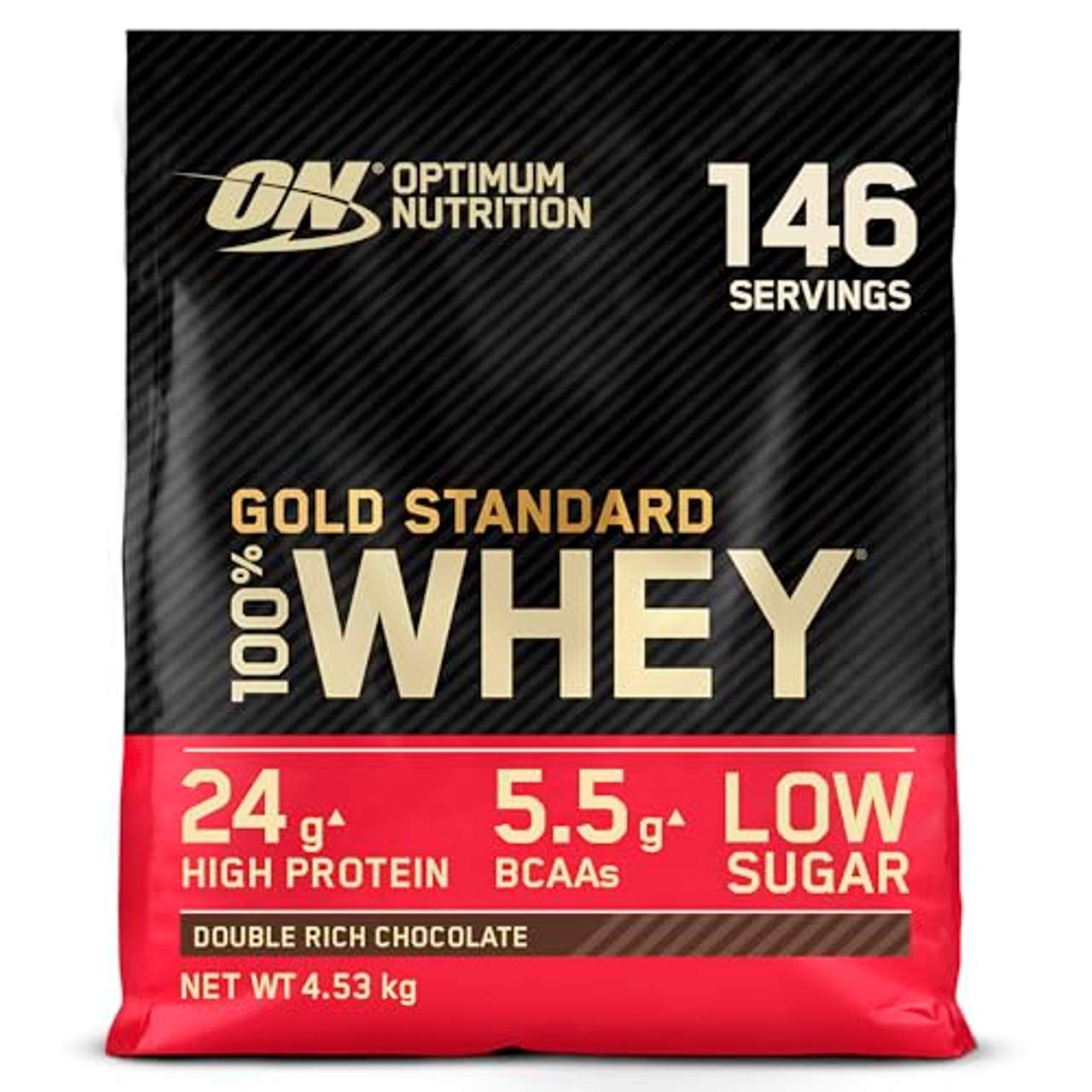 Optimum Nutrition ON Gold Standard Whey Protein Pulver100% Whey Gold Standard Pulver von Optimum Nutrition mit Double Rich Chocolate Geschmack in der 4545 g Packung. Was ist 100% Whey Gold von Optimum Nutrition und wie wirkt es? Optimum Nutrition Whey Gold Standard Protein ist einer der begehrtesten Proteinshakes überhaupt! Der cremige Drink wurde nun schon zum dritten Jahr in Folge in den USA bei den Supplement Award als „Overall Supplement Of The Year“ und als „Protein Powder Of The Year“ mit zwei Awards ausgezeichnet.Der Shake enthält das wertvolle Whey-Protein, das als schnellste Eiweißquelle überhaupt gilt und bei Kraft- sowie Leistungssportlern gleichermaßen beliebt ist. Das Protein wirkt als energiereicher Drink vor dem Training und hilft nach dem Training dem Muskelaufbau und -erhalt.100% Whey Gold von Optimum Nutrition setzt sich aus hochwertigem Molkenprotein und Molkenprotein-Isolat zusammen und enthält zudem Lactogolbulin, Glycomakropeptide und weitere spezifische Eiweiße. Egal ob Soft-, Normal- oder Hardgainer, figurbewusster Sportler oder Diät-Athlet: Whey Gold ist optimal für jeden Trainingsansatz und kann zusätzlich zu den Mahlzeiten oder als deren Ersatz konsumiert werden.Der cremige Shake ist in unzähligen leckeren Geschmacksrichtungen erhältlich und sollte zum täglichen Begleiter deines Fitnesstraining werden. ANWENDUNGSTIPPS/DOSIERUNG Für einen cremigen Shake 1 Messlöffel (29g) 100 % Whey Gold Standard mit ca. 200-250 ml kaltem Wasser, fettarmer Milch im elektrischen Mixer oder Shaker mischen. Konsumiere 100 % Whey Gold Standard 1-4 mal pro Tag oder je nach persönlichem Proteinbedarf. Hol dir das mehrfach ausgezeichnete „Supplement of the Year“!