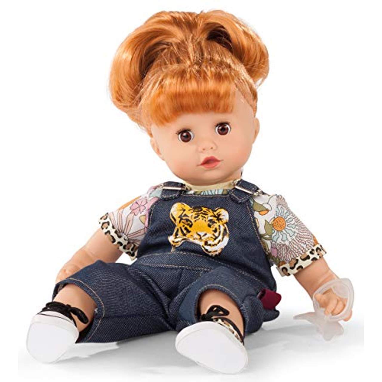 Götz 1920934 Muffin Wild Cat PuppeDie süße Puppe Muffin von Götz beeindruckt Kinder mit ihrem tollen Outfit und der hübschen Gestaltung! Ihre wunderschönen, haselnussbraunen Augen lassen sich auf Wunsch schließen. Das kupferrote Haar mit niedlichem Pony und hohem Pferdeschwanz kontrastiert perfekt mit ihrem Outfit, bei dem der Tiger auf der Latzhose im Vordergrund steht.Muffin wird inklusive Schnuller und Haargummi geliefert und kann es kaum erwarten, die ersten Abenteuer zu erleben! Details: