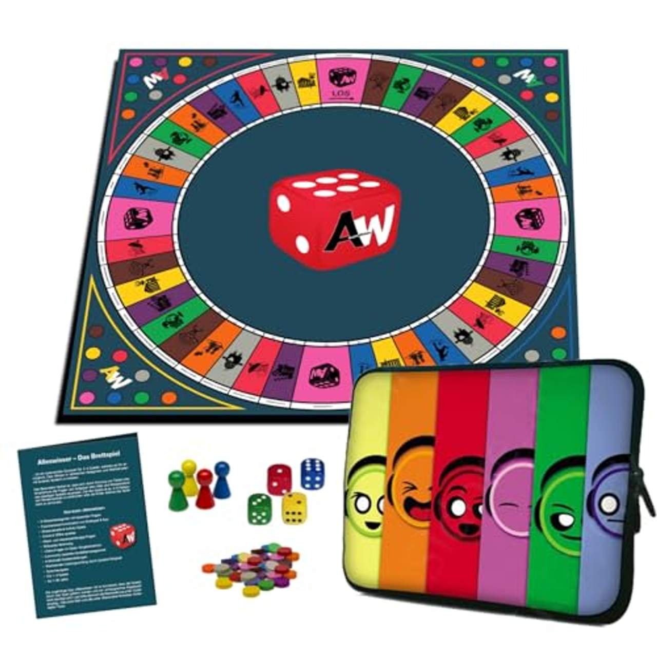 Alleswisser Das Brettspiel interaktives Quiz-SpielAlleswisser - Das Brettspiel … ist ein interaktives Brettspiel für 2-4 Spieler (oder bis zu 4 Teams mit je 2 Personen), welches es Dir ermöglicht Dein Wissen in zahlreichen Kategorien und Wettkämpfen mit anderen Spielern zu messen. Das Besondere hierbei ist, dass sich, durch Nutzung von Tablet oder Smartphone (nicht im Lieferumfang enthalten), Fragen und Aufgaben dem Alter und Wissensstand des jeweiligen Spielers anpassen.Ziel des Spiels ist es in 9 Kategorien Wissenspokale zu erkämpfen. Das kann Alleswisser: 9 Wissenskategorien mit tausenden alters- und wissensabhängigen Fragen durch Zusammenspiel von Brettspiel &, App (für iOS und Android) Wissensduelle &, Minispiele mit Spaß und Spannung für Kinder, Jugendliche, Teenager und Erwachsene mit individuellem Schwierigkeitsgrad Sprachausgabe und Wikipedia-Verlinkung zum Nachprüfen der korrekten Antwort und zum Vermitteln und Erlernen von zusätzlichem Wissen Perfekt für jedes Alter als Geburtstagsgeschenk, Weihnachtsgeschenk oder Schulanfangsgeschenk Quizspiel, Wissensspiel, Familienspiel, Gesellschaftsspiel, Partyspiel, Kinderspiel und Ratespiel für 2 - 4 Spieler (oder bis zu 4 Teams mit je 2 Personen) ab 7 bis 99 Jahre Lieferumfang: Alleswisser-Spielbrett Downloadbare Alleswisser-Gratis-App Tasche im wählbaren Design 4 Spielfiguren 8 Würfel 36 runde Pokalsteine (9 Kategorien mit je 4 Steinen) Spielanleitung Hinweis: Zum Spielen von „,Alleswisser - Das Brettspiel“, wird ein Tablet oder Smartphone (mit iOS ab Version 8 bzw. Android ab Version 4.0.3 oder höher) benötigt, welches nicht im Lieferumfang enthalten ist. Achtung: Nicht für Kinder unter drei Jahren geeignet. Enthält kleine Teile, die eingeatmet oder verschluckt werden können (Erstickungsgefahr).