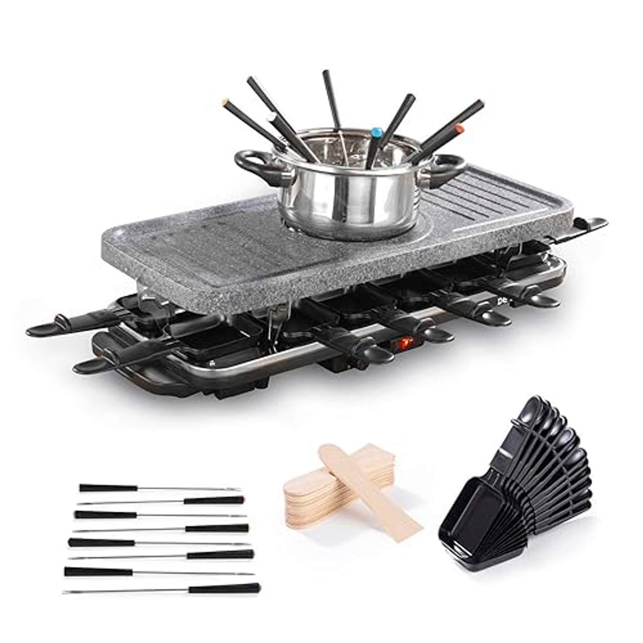 Im Lieferumfang des Geräts ist ein umfangreiches Zubehör enthalten, das dein Koch- und Esserlebnis verbessert. Es umfasst eine lange Raclette-Grillplatte, einen heißen Stein zum Grillen, 12 Raclette-Pfännchen für einzelne Portionen, 12 Holzspatel, einen Fonduetopf mit Glasdeckel und einen Aufbewahrungsring für Fonduegabeln. Insgesamt sind 38 Teile in dem Set enthalten.