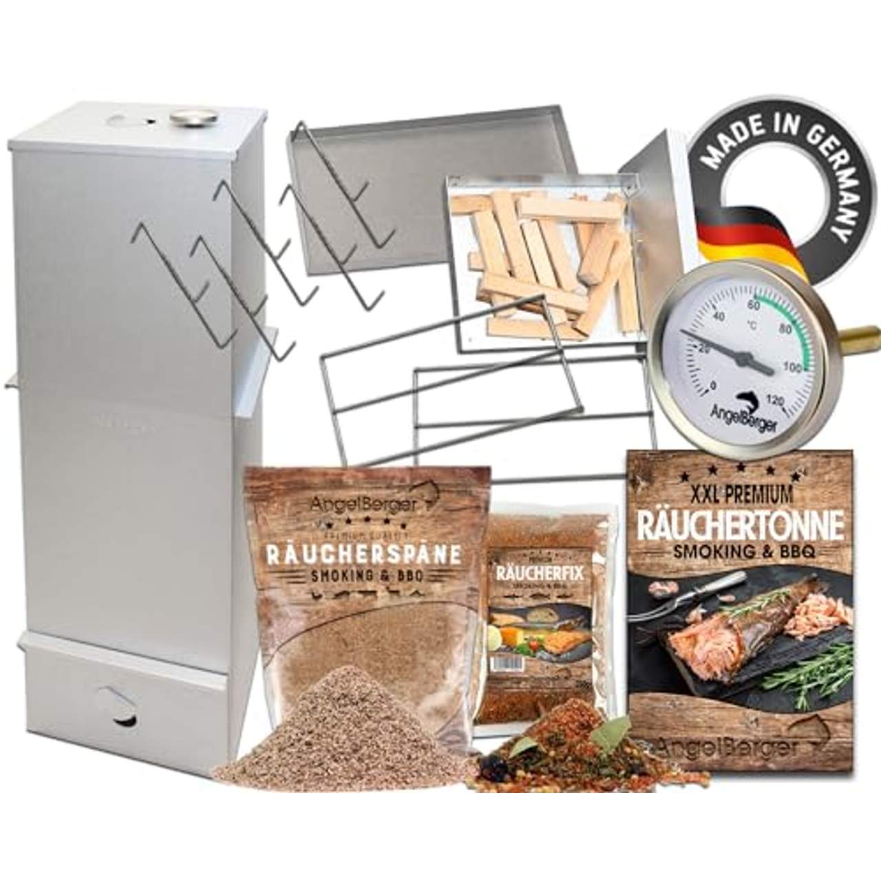Kompletter Zubehörsatz: Dieses Produkt wird mit umfangreichem Zubehör geliefert, darunter ein stabiler Sockel mit integriertem Tropfschutz, ein Feuerraum mit Griff, ein ausziehbares Oberteil, ein Rost zum Aufhängen, ein Deckel mit Holzgriff, "S"-Räucherhaken und 500g Angel Berger Räuchermehl Buche Deluxe, 600g Angel Berger Räucherlauge Spezial und 1 Räucheranleitung.