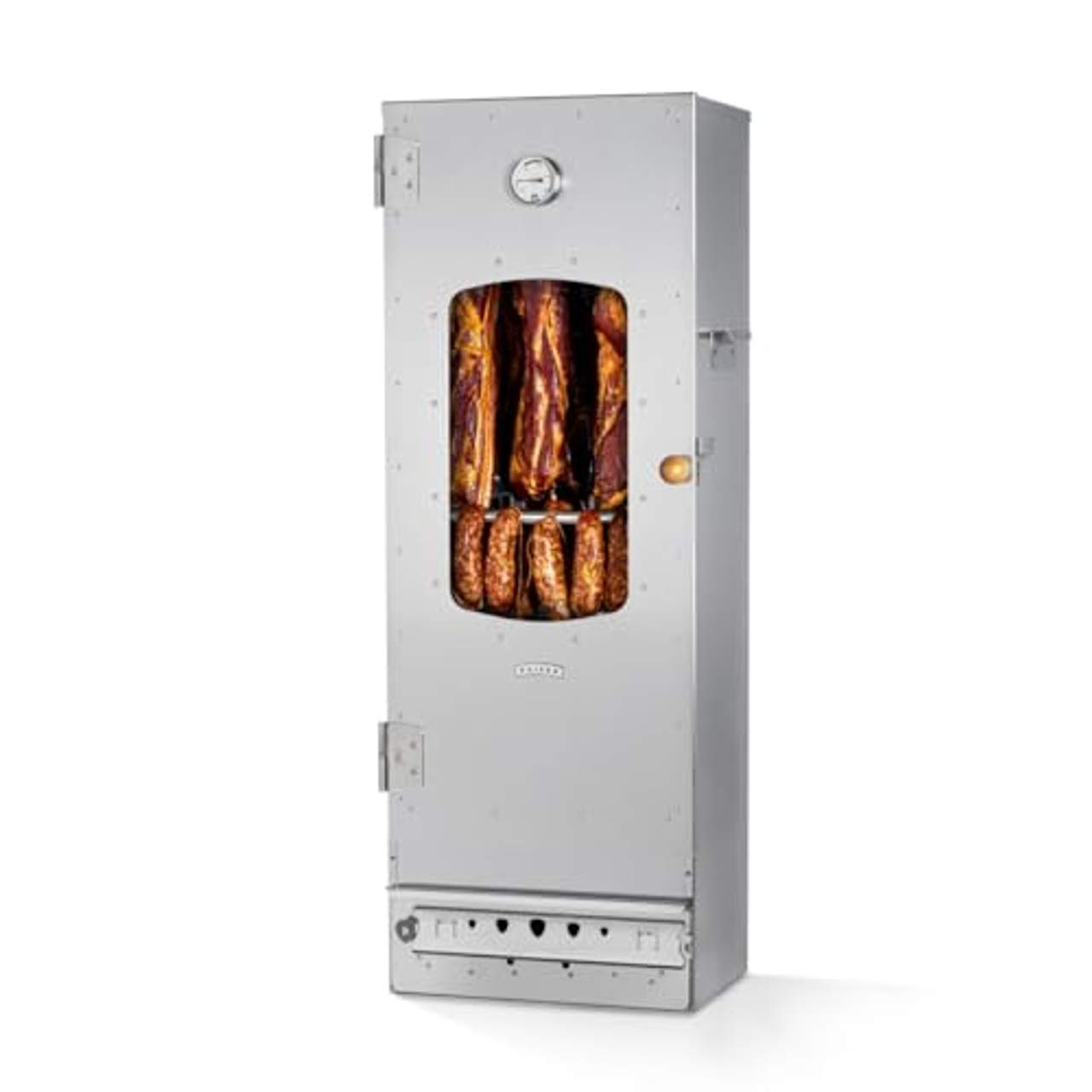 Der KAISER Company ‚100‘ High Quality Smoker Oven ist aus rostfreiem Stahl gefertigt und wird mit einer 5-Jahres-Garantie geliefert. Er ist tragbar, kompakt und verfügt über reichlich Zubehör für den ersten Gebrauch. Der Räucherofen fasst bis zu 15 kg Schweinenacken, 25 Forellen oder 50 Würste auf einmal und ist somit ideal zum Räuchern von Fleisch oder Fisch.