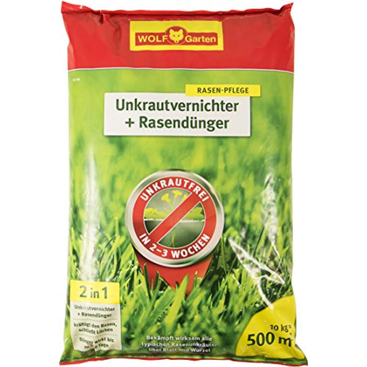 WOLF Garten SQ 500 Unkrautvernichter Plus Rasendünger 10kgDas WOLF-Garten Kombi-Präparat 2 in 1 Unkrautvernichter + Rasendünger befreit Ihren Rasen innerhalb von 2-3 Wochen zuverlässig von Klee und typischen Rasenunkräutern. Die Doppelwirkung über Unkrautblatt und -wurzel macht es besonders sicher wirksam. Durch den enthaltenen Rasendünger schließen sich schnell Lücken, die das abgestorbene Unkraut hinterlässt.Der Rasen wird langfristig (bis 100 Tage) mit allen wichtigen Nährstoffen bedarfsgerecht versorgt. Das Ergebnis: unkrautfreier, gesunder und dichter Rasen. Für unkrautfreien, gesunden und dichten Rasen 10kg für 500m² Wirkt zweifach über Blätter und Wurzeln innerhalb von 2 - 3 Wochen Düngewirkung: bis zu 100 Tage Anwendungszeitraum: Mai -September 22% Stickstoff, 5% Phosphat, 5% Kaliumoxid Wirkstoffe: 0,8% 2,4 D und 0,12% Dicamba
