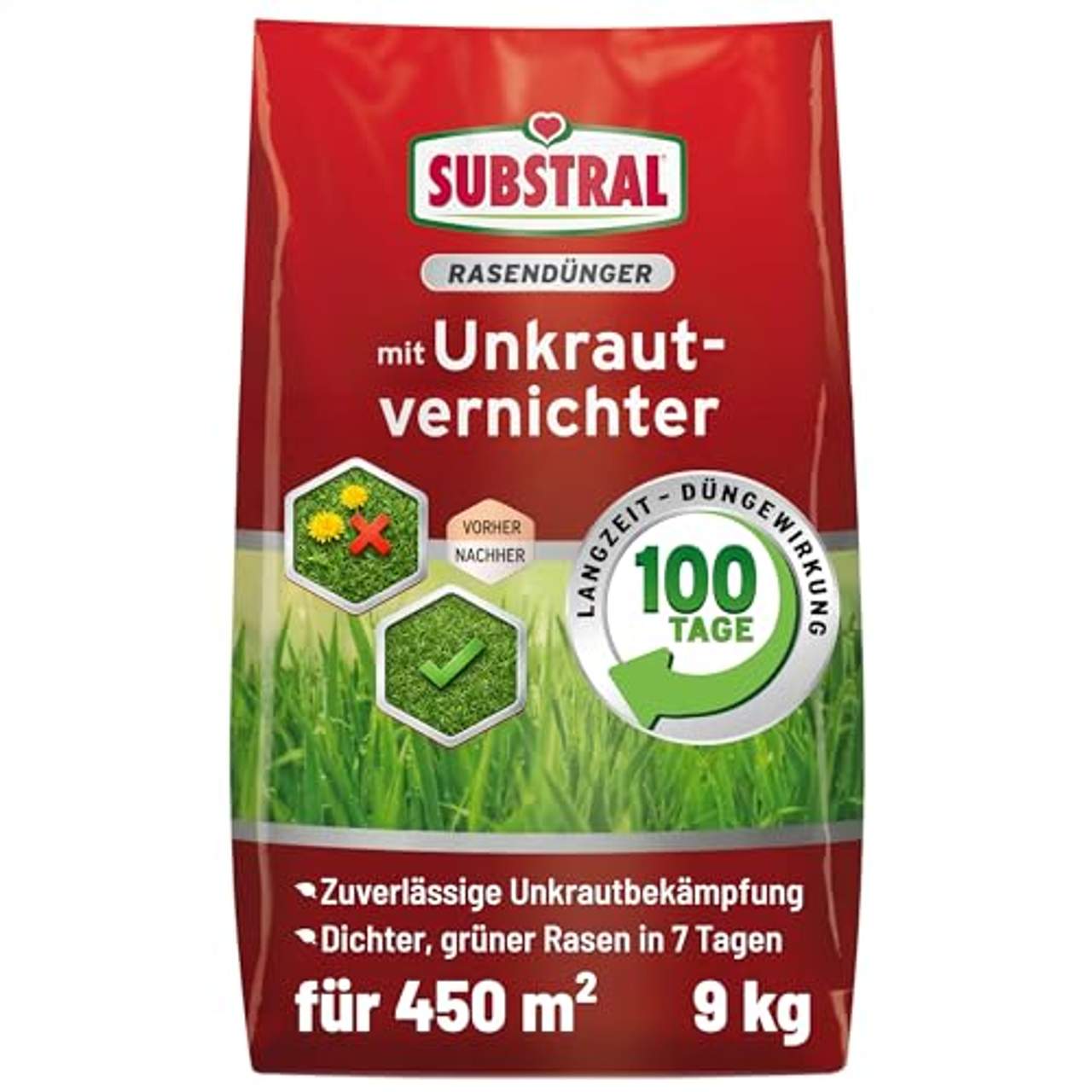 Der Substral Rasendünger mit Unkrautvernichter nutzt diese 9 kg Menge effektiv aus. Wie in der Produktbeschreibung angegeben, wurde diese Menge speziell für die optimale Ausbringung mit einem Streuwagen formuliert. Die 9-kg-Packung stellt also sicher, dass du genug Produkt hast, um es gleichmäßig auf deinem Rasen zu verteilen.