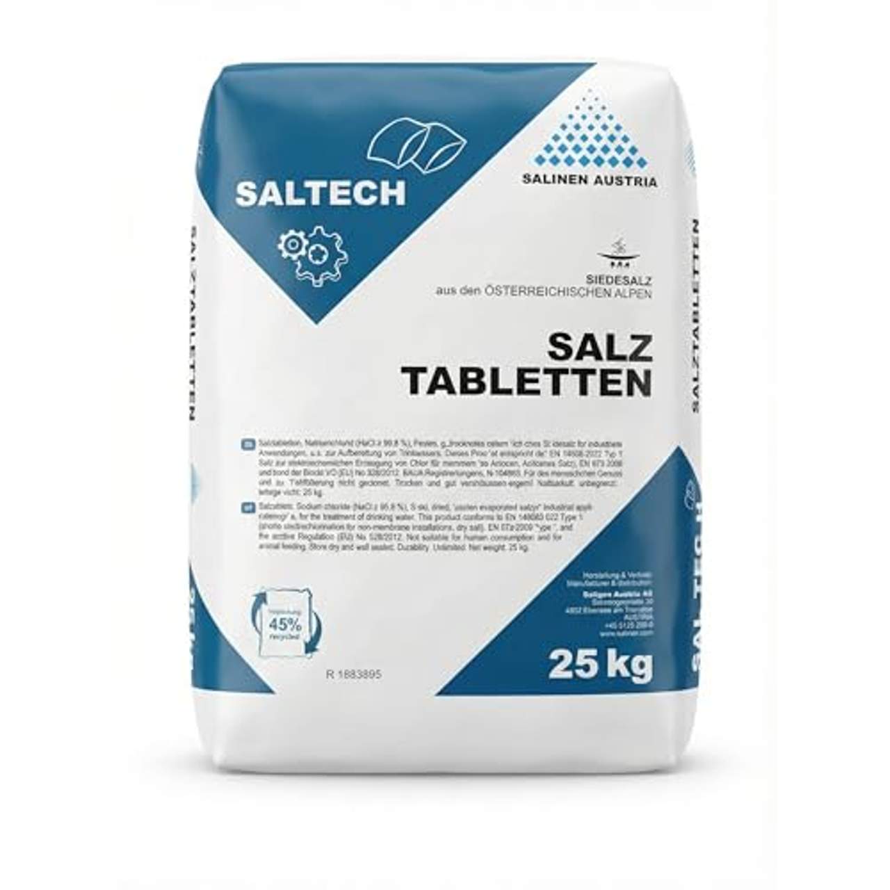 Saltech Salztabletten für WasserenthärtungsanlagenSaltech Plus Regeneriersalz Salztabletten Salztabletten aus hochreinem, qualitativem Siedesalz Details SALTECH PLUS Salztabletten sind aus hochreinem Siedesalz von exzellenter Qualität gefertigt. Mit einem Natriumchloridgehalt von 99,9% NaCl und einem geringen Sulfatgehalt lösen sich diese Tabletten rückstandsfrei auf. Sie bieten eine effektive Lösung zur Wasserenthärtung und Entkalkung, wodurch die Lebensdauer von Leitungen und Geräten sowohl in Industrieanlagen als auch in Privathaushalten verlängert wird.Zudem ermöglichen SALTECH PLUS Salztabletten bei der Salz-Elektrolyse die natürliche Produktion von Aktivchlor, ideal für die Aufbereitung von Trinkwasser und Sicherstellung hoher Wasserqualität. Die Tabletten erfüllen die Normen EN 973:2009 Typ A für die Wasserenthärtung, EN 14805:2008 Typ 1, EN 16401:2013 und die Biozid-Verordnung VO (EU) Nr. 528/2012. * Zur Regenerierung von Wasserenthärtungsanlagen * Salztabletten werden aus hochreinem, qualitativ ausgezeichnetem Siedesalz * Wird bei der Salz-Elektrolyse eingesetzt, dabei wird aus Salz auf natürliche Weise Aktivchlor erzeugt * ideal zur Aufbereitung von Trinkwasser * Für eine zuverlässige hohe Wasserqualität * 25 kg pro Sack Weitere Informationen entnehmen Sie bitte den Dateblättern.