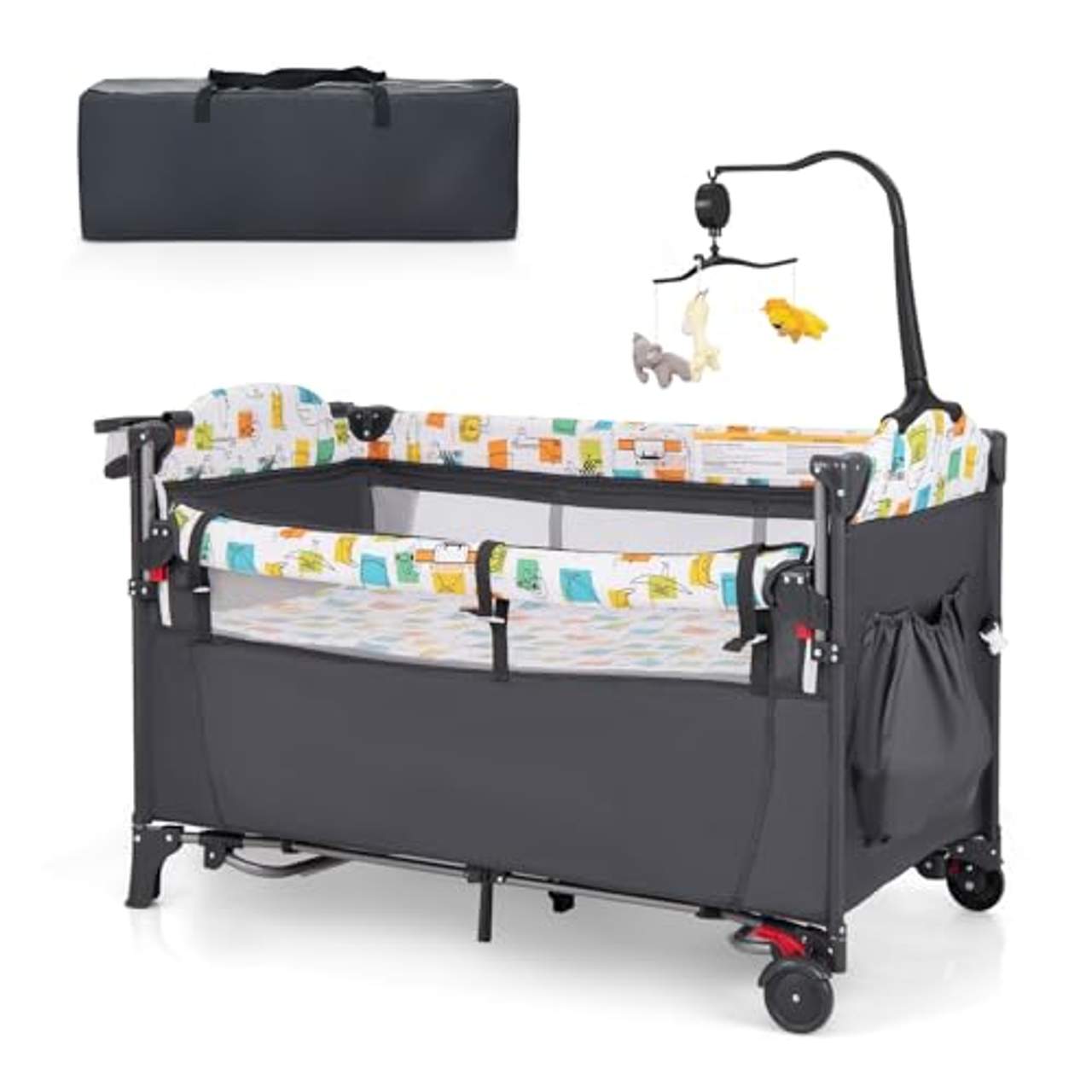 In der spezifischen Produktbeschreibung wird hervorgehoben, dass das DREAMADE 5 in 1 Reisebett eine verstellbare Armlehnenhöhe hat, die über einen benutzerfreundlichen Knopf schnell zwischen 4 Höhen eingestellt werden kann. So kann die Höhe des Reisebetts an die des Elternbetts angepasst werden. Außerdem verfügt es über ein praktisches Ablagefach für das Nötigste und ein Hängespielzeug mit drei niedlichen Tierpuppen und einer Spinnfunktion, die auch niedliche Musik abspielen kann und deinem Kind einen zusätzlichen Unterhaltungswert bietet.