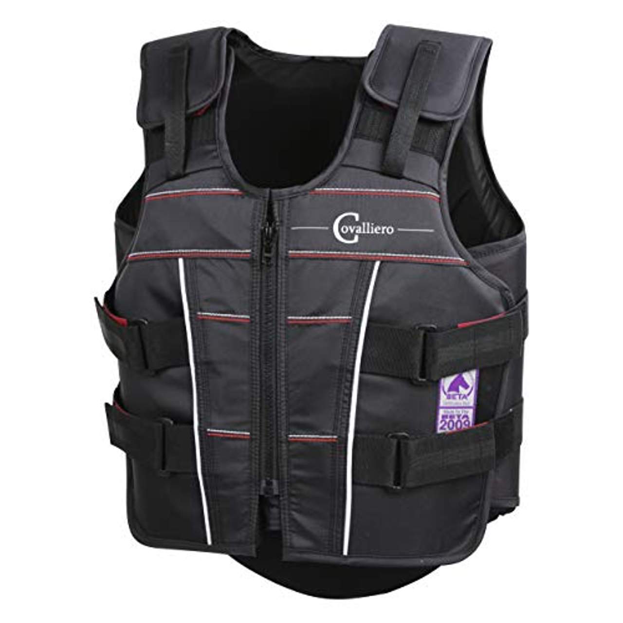 Covalliero Kinder Schutz und Sicherheitsweste Protecto light BetaDie neue Reiter Sicherheitsweste Protecto light BETA erfüllt die Anforderungen nach EN 13158-2009für Turnier-Freizeit- und Geländereiterleicht zu reinigendes AuÃenmaterialvariabel einstellbar durch Klettverschlüsse an Schulter und Taillemit reflektierenden Streifen für mehr SicherheitAuÃenmaterial: 100 % PolyamidStoÃdämpfendes Material: 100 % PVCFutterstoff: 100 % PolyesterEN 13158-2009Level 3 KinderABC XS68-72 cm64-70 cm67-72 cm S72-77 cm69-74 cm72-77 cm M77-81 cm74-77 cm78-84 cm L81-84 cm75-80 cm84-88 cm ErwachseneABC XS83 - 87 cm79 - 82 cm83 - 90 cm S88 - 93 cm83 - 90 cm86 - 93 cm M95 - 100 cm90 - 98 cm89 - 95 cm L98 - 104 cm96 - 102 cm92 - 97 cm Die neue Linie Protecto light BETA steht für mehr Sicherheit und besonderen Tragekomfort. Die Sicherheitswesten wurden nach den strengen Richtlinien von „British Equestrian Trade Association“ geprüft und zertifiziert. Dank der durchdachten Schnittführung und der variablen Klettverschlüsse sind die Westen sehr angenehm und bequem zu tragen.