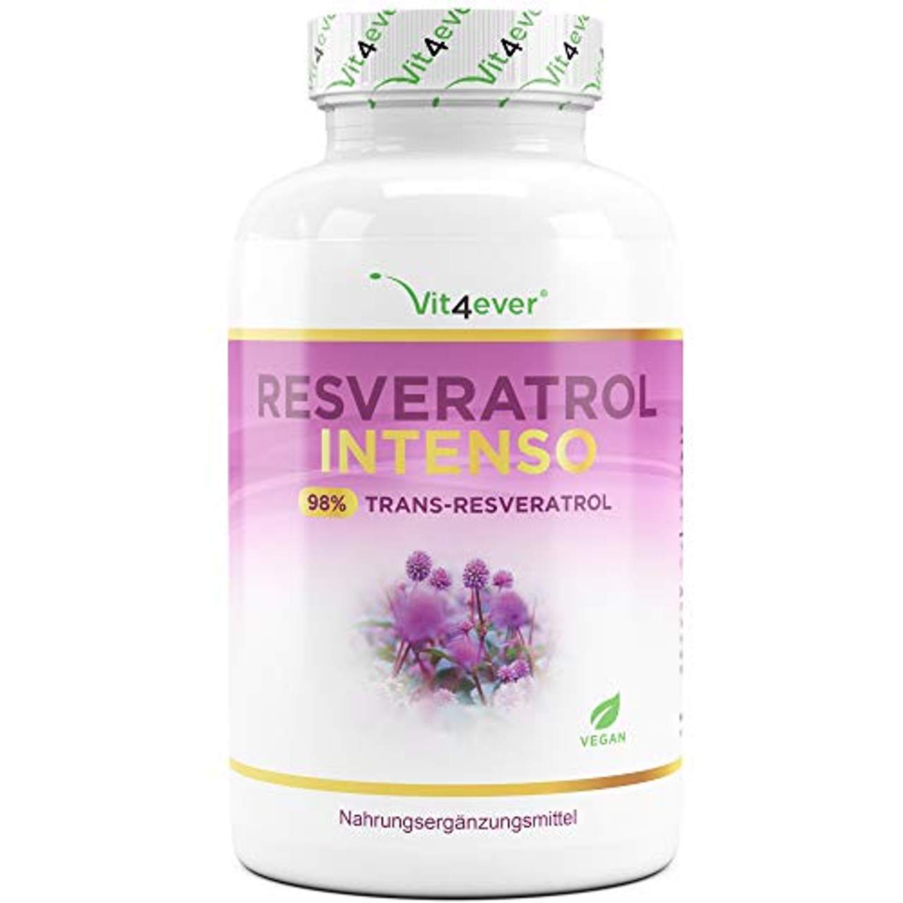 Vit4ever Resveratrol mit 500 mg pro KapselResveratrol im Allgemeinen: Resveratrol, auch trans-3,5,4â²-Trihydroxystilben genannt, ist eine organische Verbindung, die als natürliche Verbindung in verschiedenen Pflanzen vorkommt und zu der Gruppe der Polyphenole (sekundäre Pflanzenstoffe) zählt. Erstmals entdeckt wurde Resveratrol 1939 durch den japanischen Chemiker Michio Takaoka. Dieser isolierte es erstmalig aus den Blättern einer weiÃen Lilienart (Veratrum grandiflorum). Den bis dahin gröÃten Gehalt an Resveratrol fand man darauf hin erst 1963 im japanischen Staudenknöterich, aus den es bis heute noch zum GroÃteil gewonnen wird. Der unschätzbare Wert von Resveratrol ist zum einen seinen antioxidativen Eigenschaften zuzuschreiben, wie es auch bei anderen Pfanzenstoffen, beispielsweise bei OPC der Fall ist. Zum anderen liegt die groÃe Besonderheit von Resveratrol in seiner natürlichen Abwehrfunktion! Pflanzen, welche Resveratrol enthalten, nutzen dies, um sich vor schlechten Wachstumsbedingungen und Umwelteinflüssen wie Unwettern oder hohen UV-Strahlungen zu schützen, somit kann man sagen, dass Resveratrol das natürliche Immunsystem der Pflanzen darstellt und zu deren Selbstschutz dient.Aufgrund seiner zahlreichen positiven Eigenschaften erfreut sich Resveratrol nicht nur bei Nahrungsergänzungsmitteln gröÃter Beliebtheit, sondern ist auch in Anti-Aging-Produkten wie Cremes und Lotionen nicht mehr wegzudenken. An dieser Stelle würden wir gerne sehr viel mehr über die zahlreichen Anwendungsmöglichkeiten sowie laufende Studienerkenntnisse zu Resveratrol schreiben. Dies ist aber leider aufgrund der aktuellen Gesetzeslage in Deutschland nur bedingt möglich.Bitte informieren Sie sich daher über Resveratrol selber, z.B. im Internet. Highlights auf einen Blick: 60 hochdosierte Kapseln mit 500 mg echten Resveratrol. Premium: Optimiert mit 10 mg schwarzen Pfeffer Extrakt pro Kapsel (95% Piperin Anteil) für eine verbesserte Bioverfügbarkeit.Praktischer 2 Monatsvorrat (60 Tage Anwendung) bei der Einnahme von einer 1 Kapsel täglich. Für unsere Kapseln setzen wir 98% Trans-Resveratrol ein, welches aufwendig aus natürlichem japanischen Staudenknöterich Extrakt gewonnen wird. Unsere Kapseln sind zu 100% vegan. Sind frei von Magnesiumstearat, Aromen, Farbstoffen, Stabilisatoren, Gelatine & selbstverständlich auch GMO-frei, laktosefrei, glutenfrei & ohne Konservierungsstoffe. Unabhängig laborgeprüft auf Schwermetalle, Schimmelpilze, E. Coli, Salmonellen & weitere relevante Prüfkriterien. Vorkommen von Resveratrol: Resveratrol in gröÃeren Mengen kommt vor allem vor in Himbeeren, Erdnüssen, Maulbeeren, Trauben (Weintrauben), Teeblättern und dem japanischen Staudenknöterich vor. Die höchste Bekanntheit erlangte Resveratrol, da es durch die Verarbeitung von Trauben auch im Rotwein zu finden ist.An dieser Stelle sollte allerdings erwähnt werden, dass der Resveratrol-Gehalt in Rotwein nicht so hoch wie gewünscht ausfällt. Vit4ever premium Qualität Vit4ever Resveratrol Intenso Kapseln, überzeugen mit einem 98%igen Trans-Resveratrol Gehalt = 500 mg, welcher aus 510 mg reinem und hochwertigem japanischen Staudenknöterich Extrakt gewonnen wurde. Optimiert haben wir das Ganze noch durch die Zugabe von Schwarzem Pfefferextrakt, welches 9,5 mg reinem Piperin entspricht, um ein Maximum an Resorption zu schaffen. Resveratrol Intenso Kapseln sind 100% vegan und frei von schädlichen Zusatzsoffen.