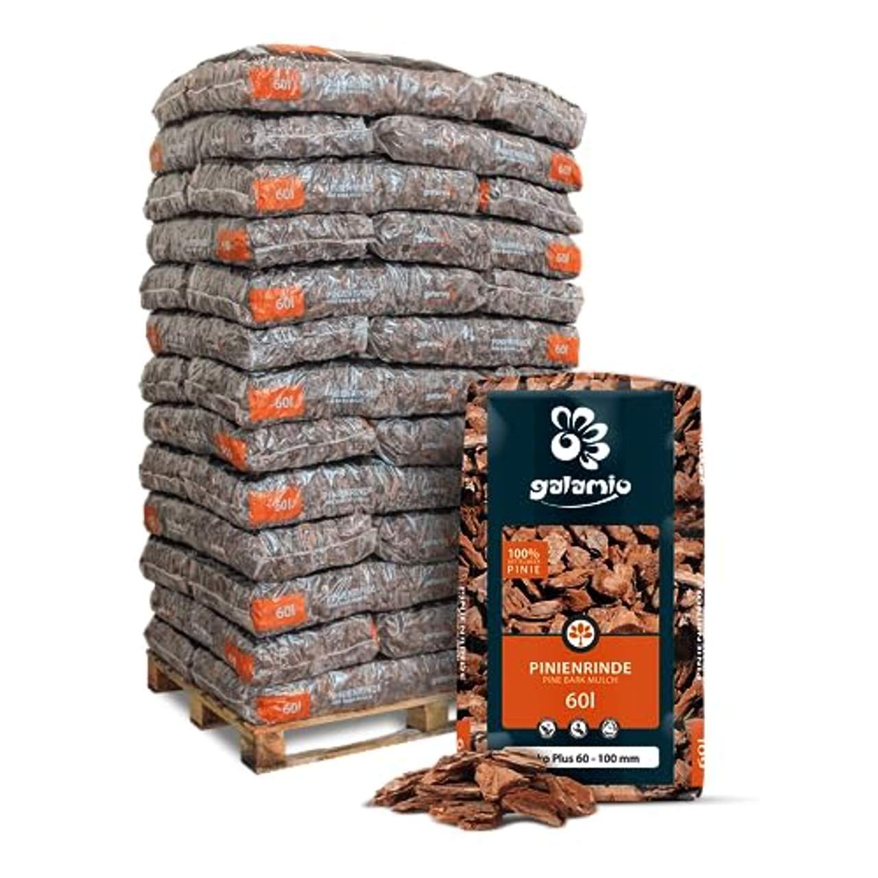 Du kannst GALAMIO Pinienrinde Pinienmulch bequem online in praktischen 60-Liter-Säcken kaufen. Diese Säcke werden ordentlich gestapelt auf Paletten durch zuverlässige Frachtdienste geliefert. Du kannst auch mehrere Säcke auf einmal bestellen und je nach Bedarf von Mengenrabatten profitieren.