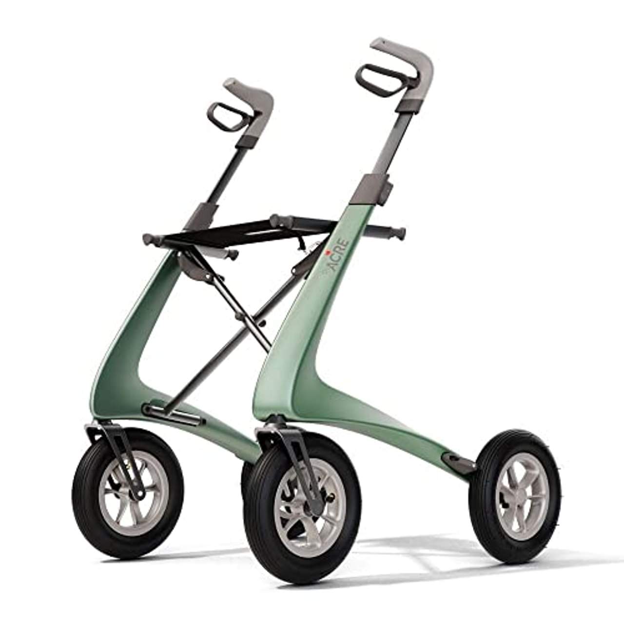 Der Rollator Carbon Overland von Acre ist ein leichter All-Terrain-Rollator, der nur 6,7 kg wiegt. Dank seines Kohlefaserrahmens, der luftgefüllten Gummireifen und der stabilen Vorderradgabel mit versiegelten Lagern kann er auch schwieriges Gelände bewältigen, ohne seine Struktur zu beeinträchtigen.