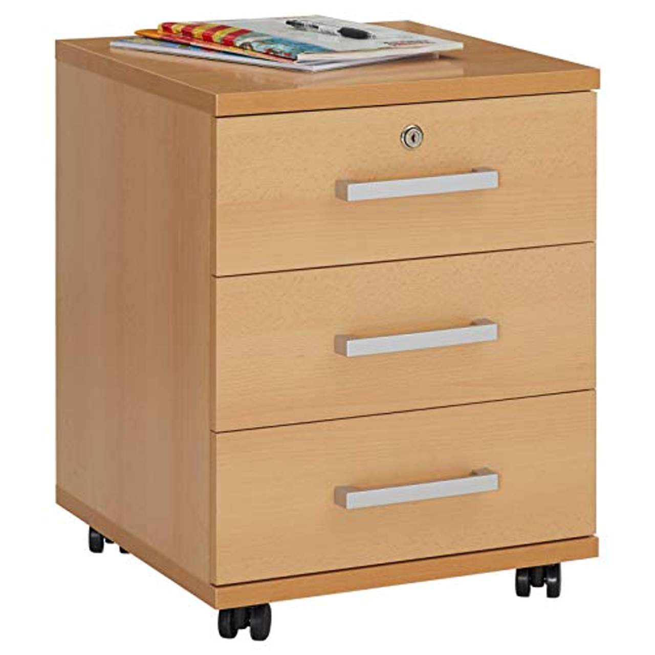 CARO-Möbel Rollcontainer Bürocontainer Büroschrank VancouverDer Rollcontainer VANCOUVER in verschiedenen modernen Farben bietet mit seinen 3 Schubladen genügend Stauraum zum Aufbewahren sämtlicher Büromaterialien, sowie die Möglichkeit die erste Schublade abzuschließen. Die Deckplatte besteht aus einer reibungs- und kratzfesten Spanplatte mit Melaminharzbeschichtung, auf der unbedenklich weitere Gegenstände abgestellt werden können, wie z. B. eine Geldkassette oder ein Nähkästchen.Durch die verstärkten Kunststoffrollen, kann der Container problemlos überall hin geschoben werden. Materialbeschreibung: Der Rollcontainer ist aus Spanplatte in Melaminharzbeschichtung gefertigt, reibungs- und kratzfest Ausstattung / Merkmale des Produkts: Maximale Belastbarkeit der Ablagefläche 15 kg Die oberste Schublade ist abschließbar Maximale Belastbarkeit der Schubladen je 3 kg Leicht zu reinigen mit einem feuchtem Baumwolltuch Verstärkte Kunststoffrollen, davon 2 gebremst Höhe der Rollen, ohne Stift, 4 cm Die Schubkastenauszüge laufen auf Kugeln Versand &, Montage: Lieferumfang: Rollcontainer inklusive Aufbauanleitung Artikel wird zerlegt geliefert Kundenfreundliche Montage mit Hilfe der beigelegten Aufbauanleitung. Lieferung erfolgt ohne Dekoration Lieferung erfolgt per Paketdienst
