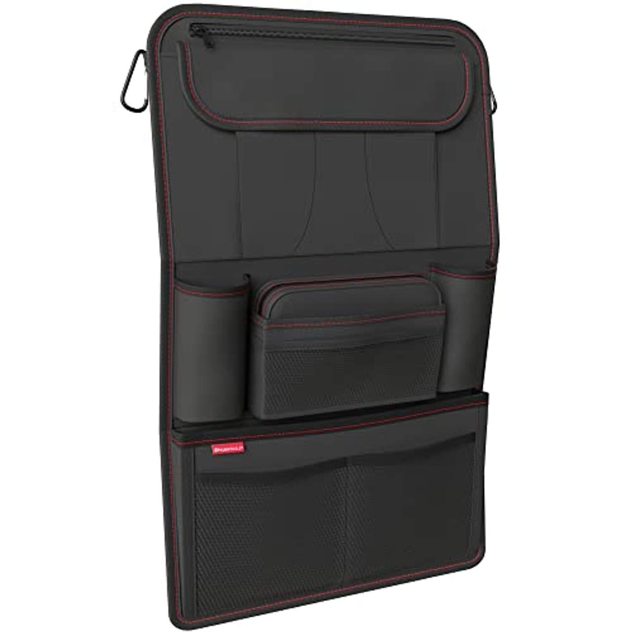 Der Autositz-Organizer hat stabile Ecken und eine verstärkte Rückwand, so dass er sich eng an den Sitz anschmiegt. Außerdem ist er mit roten Ziernähten versehen, die ihn optisch ansprechend machen.