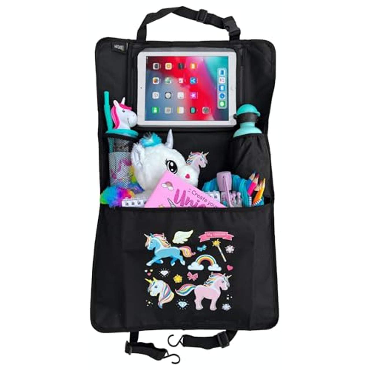 Der HECKBO 1x Kinder Autositz Rückenlehnenschutz Organizer ist mit einem lebendigen Einhornmotiv versehen, das die Rücksitzumgebung auflockert und einen ansprechenden und ansprechenden Raum für die Kinder schafft.