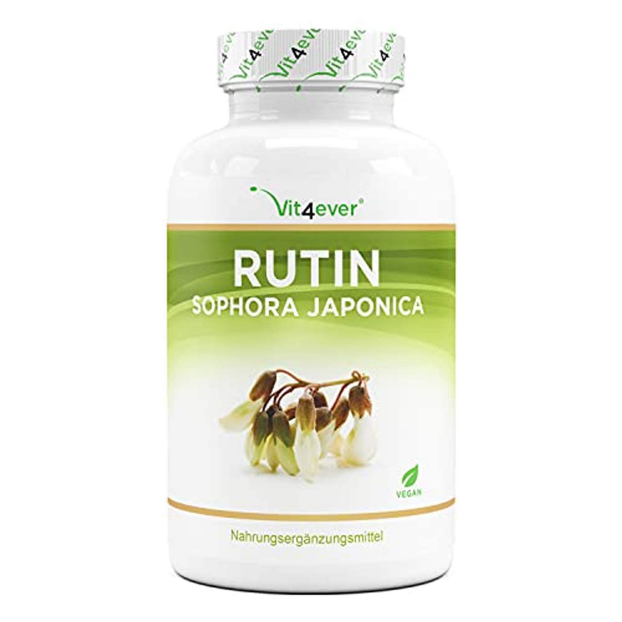 Vit4ever Rutin 500 mgRutin im Allgemeinen Rutin ist ein gelb gefärbter, sekundärer Pflanzenstoff (Pflanzenpigment) und gehört zu der Gruppe der Flavonoide und ist in diversen Gemüse- und Früchtesorten in den Blüten, Blättern und Stängeln wiederzufinden. Als Rutin bezeichnet man eine Verbindung aus Quercetin und dem Disaccharid Rutinose.Einige Pflanzen bilden vor allem Rutin, um sich vor der UV-Strahlung und dem Befall von Bakterien und Microorganismen zu schützen, zudem weist Rutin, wie viele Flavonoide, starke antioxidative Eigenschaften auf, was auch der Grund dafür ist, dass es immer mehr Zustimmung in der Kräutermedizin findet.Highlights auf einen Blick: 180 hochdosierte Kapseln mit 500 mg reinem Rutin pro Kapsel. Praktischer 6 Monatsvorrat (180 Tage Anwendung) bei der Einnahme von einer 1 Kapsel täglich. Für unsere Kapseln verwenden wir natürliches Premium Granulat mit der höchsten Bioverfügbarkeit. Jede Kapsel enthält 526 mg Japanischer Schnurbaum-Extrakt darin enthalten sind 500 mg reines Rutin (95% Rutin Anteil). Unsere Kapseln sind zu 100% vegan.Sind frei von Magnesiumstearat, Aromen, Farbstoffen, Stabilisatoren, Gelatine & selbstverständlich auch GMO-frei, laktosefrei, glutenfrei & ohne Konservierungsstoffe. Laborgeprüft Belastungen & Verunreinigungen, wie z.B. Schwermetalle, Schimmelpilze, E. Coli, Salmonellen & weitere relevante Prüfkriterien. Natürliches Vorkommen von Rutin Rutin kommt ausschließlich nur in der Natur vor. Einige Pflanzen und Lebensmittel, welche einen recht hohen Gehalt an Rutin aufweisen, sind u.a.: Ginkgo Biloba, Spargel, Schalen von Citrusfrüchten und Äpfel, Kirschen, div.Beeren, Buchweizen, grüner & schwarzer Tee und Eukalyptus. Vit4ever Qualität Bei Vit4ever hat Qualität absolute Priorität! Aus diesem Grund verwenden wir für unsere Rutin Kapseln auch ein 100% pflanzliches Extrakt , welches aus dem Japanischen Schnurbaum (Sophora Japonica) mittels Wasserextraktion gewonnen wurde und einen Rutingehalt von mind. 95% aufweist. Zudem verzichten wir komplett auf jede Art von Trenn- oder Fließmitteln und verwenden eine 100% vegane HPMC Kapsel.Unsere hochdosierten Rutin Kapseln sind natürlich 100 % vegan und frei von Gelatine, Aromen, Farbstoffen, Stabilisatoren und gentechnikveränderten Zutaten (GMO frei).