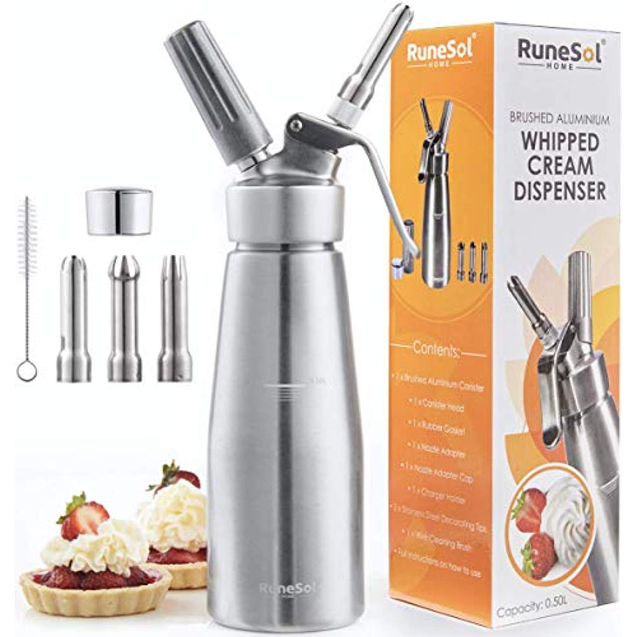 Der RuneSol Sahne-Aufschlager Profi Sahnesyphon Aluminium ist ein professioneller Sahneschläger aus Aluminium und Edelstahlteilen. Er kommt mit einer 100%igen Geld-zurück-Garantie, wenn Sie nicht zufrieden sind. Das Gerät kann zur Herstellung von Eisbechergarnierungen, Mousse, Saucen, Schaum und vielem mehr verwendet werden! Die Schlagsahne bleibt mehrere Tage lang frisch, wenn sie im Kühlschrank aufbewahrt wird. Eine einfache Schritt-für-Schritt-Anleitung wird mitgeliefert. Distickstoffoxid-Patronen (nicht im Lieferumfang enthalten) sind erforderlich.