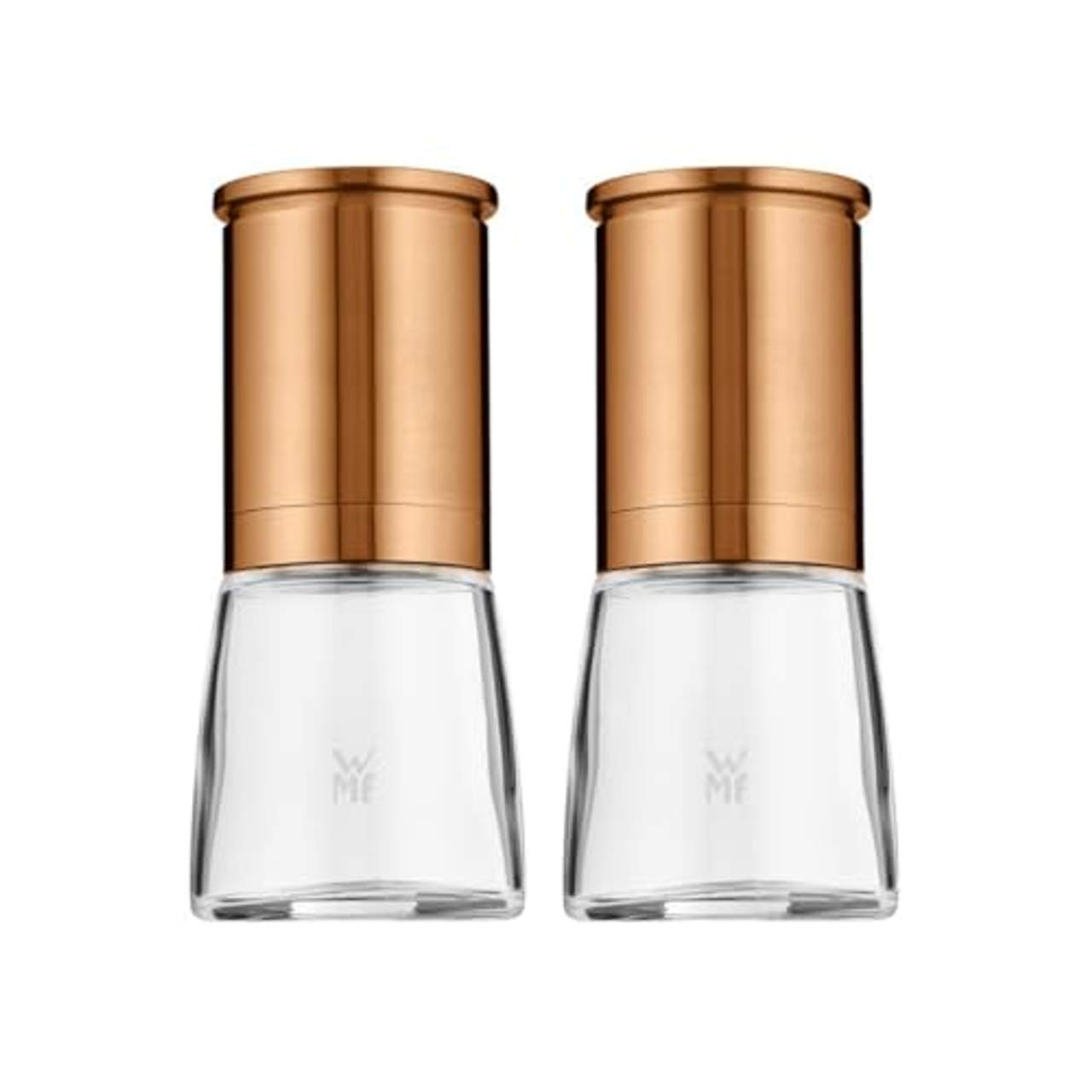 WMF De Luxe Salz und Pfeffermühle Set 2-teiligLieferumfang: 2x Gewürzmühle unbeschriftet (Höhe 14 cm, Ø 6 / 4,7 cm) inkl. beigelegte Aufkleber mit „Salz“, „Pfeffer“ Ehre, wem Ehre gebührt. Die Gewürzmühlen sorgen mit integriertem Ceramill Original Keramikmahlwerk aus der Kollektion De Luxe für frisch und nach Wunsch gemahlene Gewürze bei Tisch. Mit dem 2-teiligen WMF Gewürzmühlen-Set De Luxe in edler Anmutung aus Glas und hochwertigem Cromargan:Edelstahl Rostfrei 18/10 in trendigem Kupfer werden Pfeffer, getrocknete Chillis, Kräuter oder Salz exakt so gemahlen wie gewünscht. Die Handhabung mit großzügiger Einfüllöffnung ist kinderleicht, die Pflege ebenso. Der Glasbehälter ist selbstverständlich spülmaschinengeeignet, für alles weitere genügt einfaches Ausspülen und lufttrocknen lassen.Salz und Pfeffer werden jetzt kopfüber gemahlen: Bei der Gewürzmühle Ceramill de Luxe sitzt das Mahlwerk oben und hinterlässt auf dem Tisch keine Gewürzspuren. Ein Aromadeckel schützt das Mahlwerk und bewahrt das Aroma. Zum Mahlen nehmen Sie den Deckel ab, halten die Mühle kopfüber am Edelstahlrand fest und drehen das Glas – schon kommt das gemahlene Pulver heraus. Die Gewürzmühle aus Edelstahl und Glas ist mit dem original Ceramill Mahlwerk aus Keramik ausgestattet, die Mahlstärke lasst sich stufenlos einstellen. WMF gibt auf das Mahlwerk zehn Jahre Garantie, es ist korrosions- und abriebfrei.Die 14 Zentimeter hohe Gewürzmühle kann auseinandergenommen und der Glasbehälter in der Spülmaschine gereinigt werden.