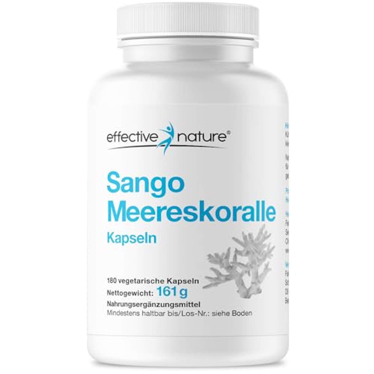 effective nature Sango MeereskoralleSango-Kapseln: 100% Mineralstoffe, 100% nachhaltig Die Sango-Kapseln enthalten die wertvollen Inhaltsstoffe der Sango-Koralle, die von den malerischen Korallenriffen vor der Insel Okinawa stammt. Sie liefern einen wichtigen Mineralstoffkomplex in einem natürlichen Verbund – vor allem Calcium und Magnesium – der sich vielerlei positiv auf zahlreiche Prozesse im menschlichen Körper auswirken kann. Die Gewinnung der Rohstoffe erfolgt nachhaltig und umweltverträglich: Bei den verwendeten Rohstoffen handelt es sich nämlich um abgebrochene Teile des Korallengerüstes - das heisst ein Raubbau am Riff findet nicht statt. Somit handelt es sich bei den Sango-Kapseln um ein 100 % natürliches- und umweltverträgliches Produkt, das darüber hinaus auch für Veganer und Vegetarier geeignet ist. Die Bioverfügbarkeit ihrer Inhaltstoffe ist wesentlich höher, als dies bei herkömmlichen Mineralstoffpr…„“