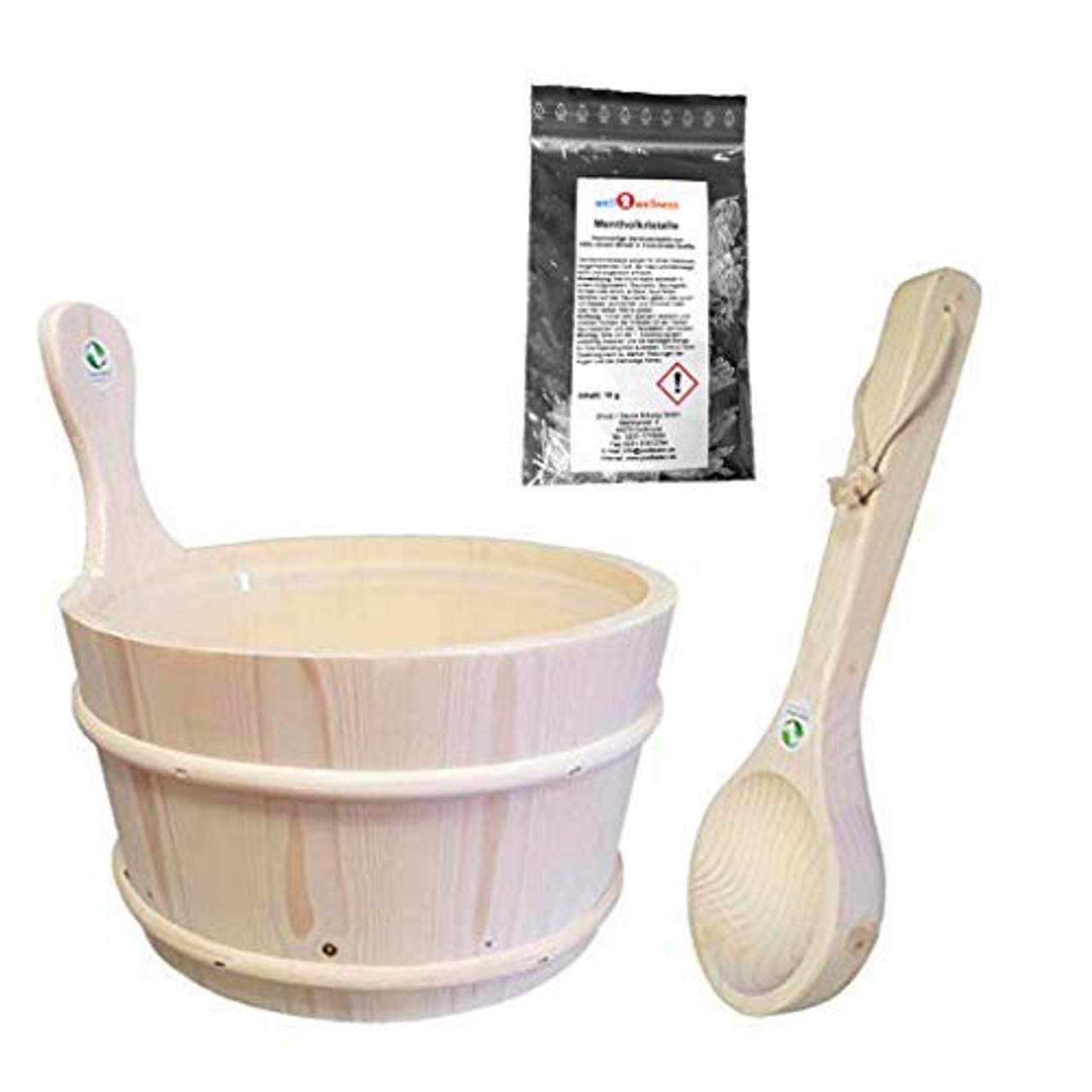 SudoreWell Saunakübel Saunaeimer aus Espe 4,0 ltrAufgusseimer aus Espenholz hell mit einer verlängerten Daube als Griff! Inkl. einem Kunststoffeinsatz und einer Schöpfkelle aus Holz plus 10g Mentholkristalle. Naturbelassen Made in Germany! Ideal zum Anmischen von well2wellness Saunaaufguss - Konzentraten!