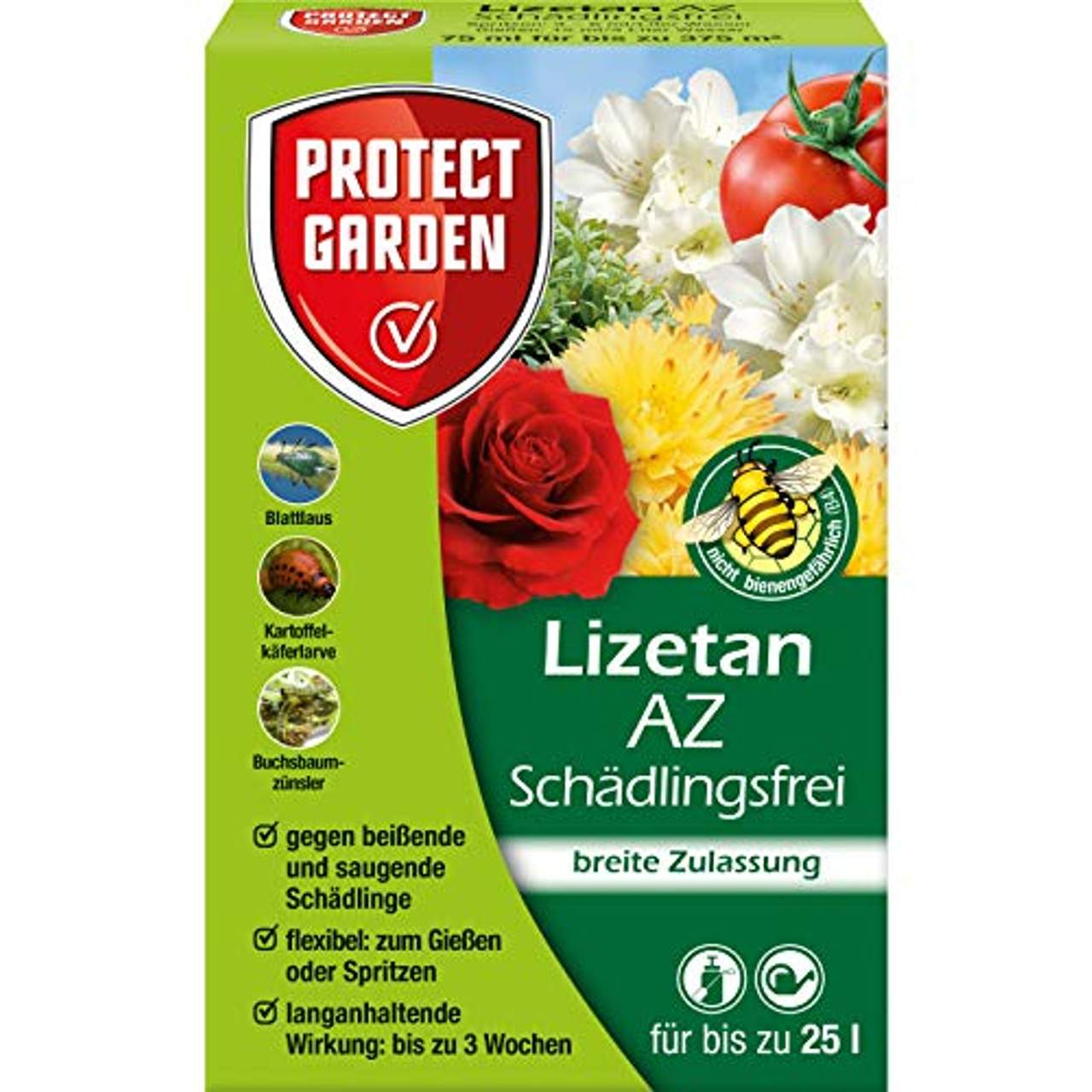- Wirksame Kontrolle: PROTECT GARDEN Lizetan AZ Schädlingsfrei ist ein nicht bienengefährliches Mittel, das gegen saugende und beißende Schädlinge an Zierpflanzen, frischen Kräutern, Kartoffeln und Obst wirksam ist. Es wirkt schnell gegen Schädlinge wie Blattläuse, Kartoffelkäfer und Buchsbaumzünsler und sorgt für einen frühen Fraß- und Saugstopp.