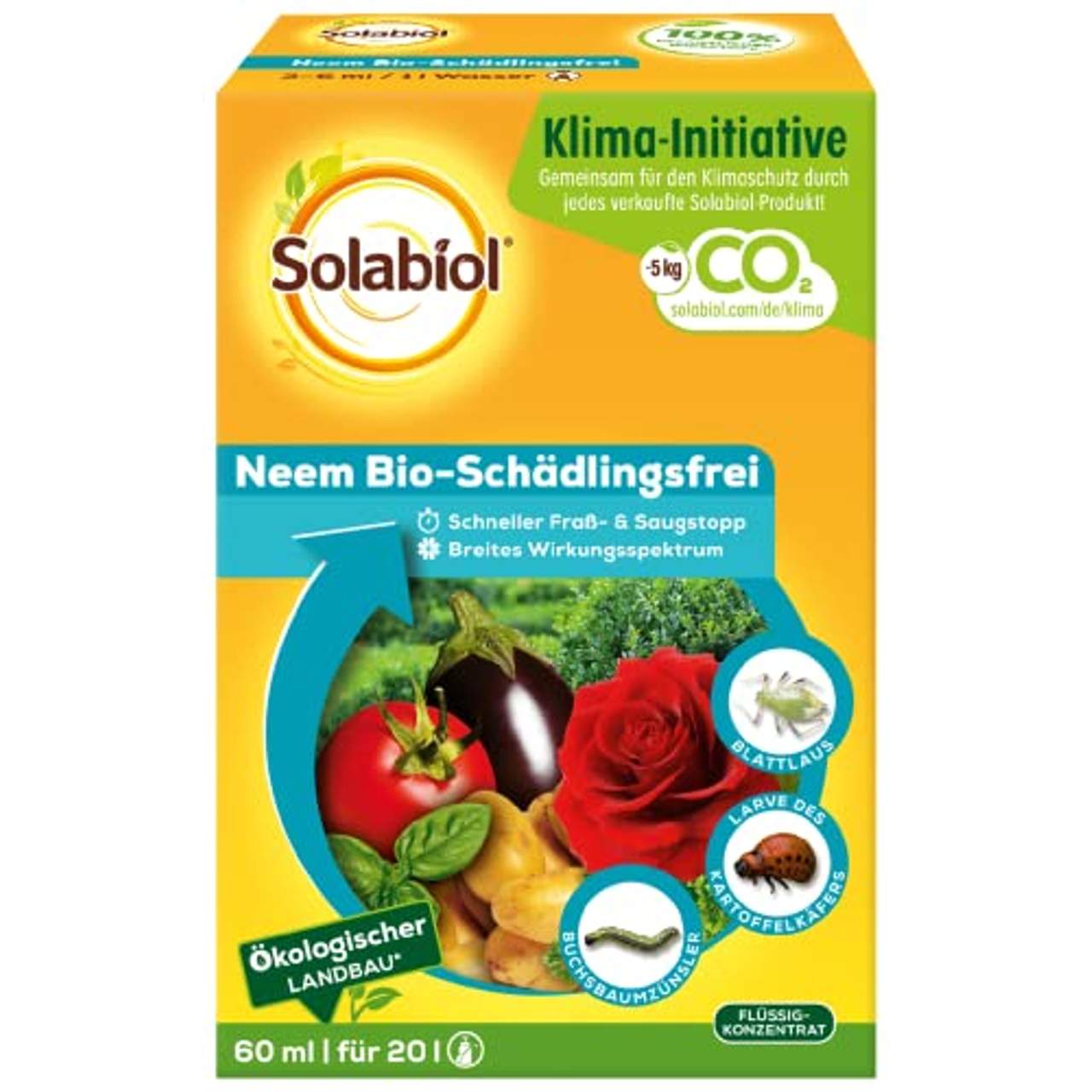 Solabiol Neem Bio-Schädlingsfrei biologische Schädlingsbekämpfung an ZierpflanzenDas Solabiol Neem Bio-Schädlingsfrei 60 ml ist ein Mittel gegen saugende und beißende Schädlinge (einschließlich Buchsbaumzünsler und Kartoffelkäfer) an Zierpflanzen, frischen Kräutern, Kartoffeln und Gemüse. Spinnmilben werden in den festgesetzten Anwendungsgebieten miterfasst. Zudem ist es gegen Trauermücken-Larven (Gießanwendung) im Gewächshaus zugelassen.60 ml reichen dabei für 20 l Spritzbrühe. Das Produkt ist dabei schonend für Nützlinge und in Deutschland als nicht bienengefährlich eingestuft. Das Mittel wird auch im biologischen Landbau erfolgreich eingesetzt. Pfl.-Zulassungs-Nr. (Deutschland): 0024436-68 Pfl.-Reg.-Nr. (Österreich): 2699-907