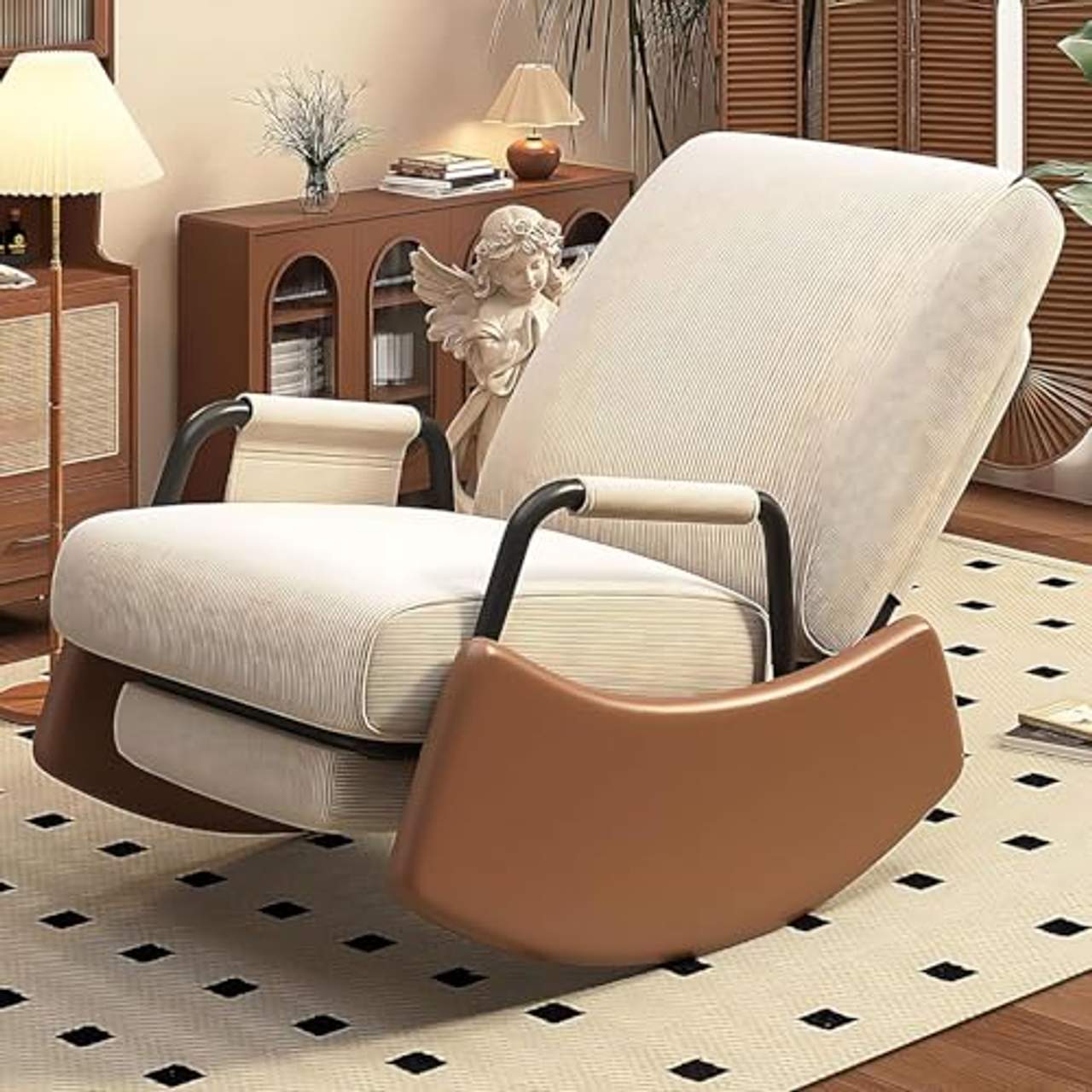 Komfort ist ein Hauptmerkmal des Schaukelstuhls bequemer Sessel. Seine Polsterung besteht aus hochwertigem Kordstoff, der sich weich anfühlt. Das ergonomische Design wurde speziell dafür entwickelt, deinen Körper an den richtigen Stellen zu stützen, so dass dein Rücken weniger belastet wird und du lange Stunden der Entspannung ohne Beschwerden genießen kannst.