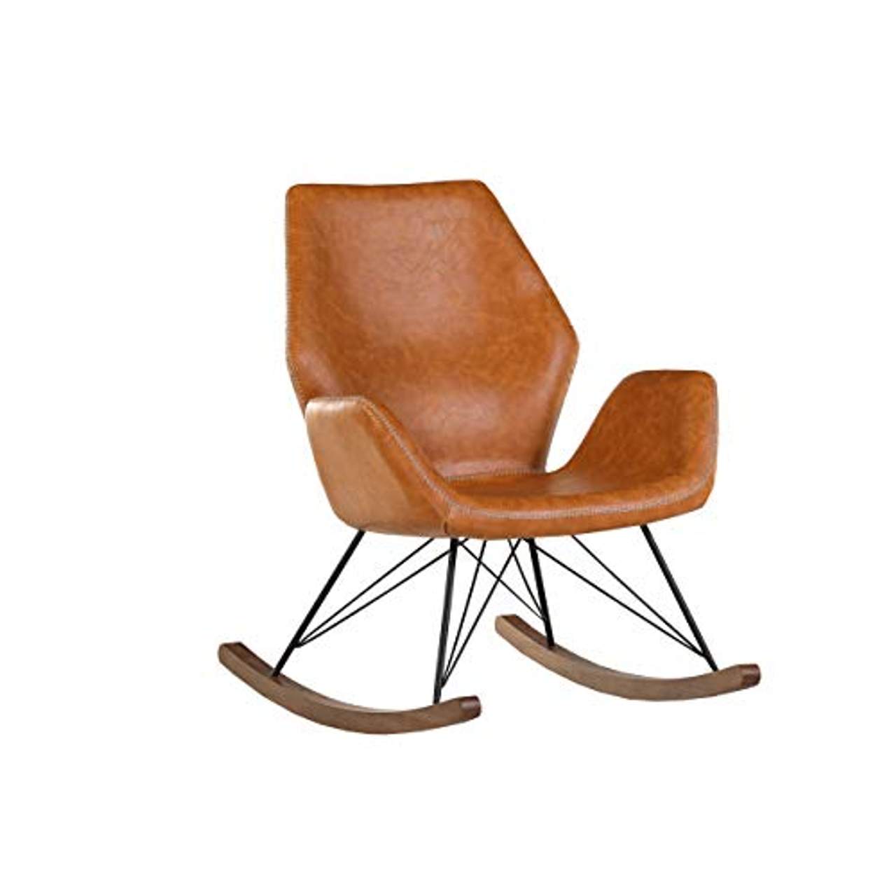 Der Bezug des Schaukelstuhls besteht aus einem cognacfarbenen Material in Lederoptik. Diese Art von Material verleiht dem Gesamtdesign eine zusätzliche Eleganz und macht ihn zu einer attraktiven Ergänzung für jedes Zuhause oder Büro.
