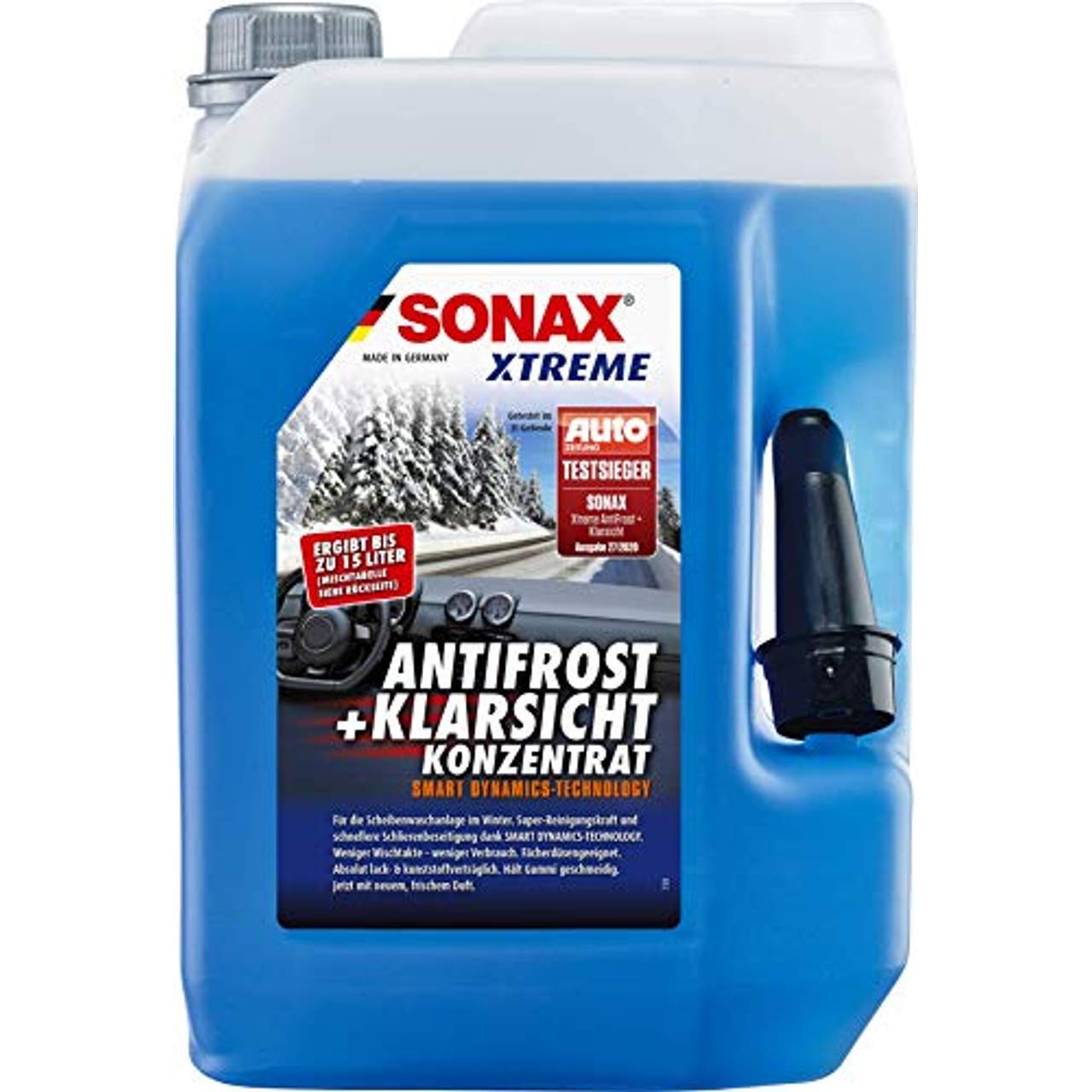 SONAX Xtreme AntiFrost+KlarSicht Konzentrat ist ein 5-Liter-Scheibenfrostschutz-Konzentrat im Kanister mit zwei Griffen. Es liefert bis zu 15 Liter Reinigungsflüssigkeit für eine streifenfreie Scheibenreinigung bei eisigen Temperaturen. Die SMART DYNAMICS TECHNOLOGY sorgt für weniger Wischvorgänge und einen geringeren Verbrauch. Dieses Produkt ist mit Lack, Gummi und Kunststoff kompatibel und verhindert Vereisung und Verstopfung. Außerdem hält es die Wischergummis geschmeidig und funktioniert bei allen Wasserhärten.