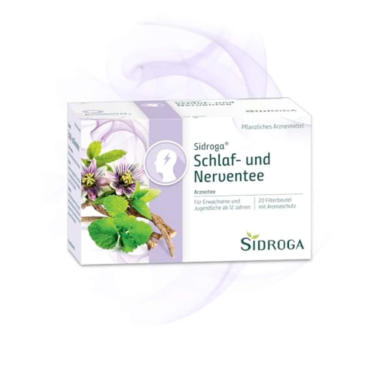 Sidroga Schlaf- und NerventeeSidroga Schlaf- und Nerventee ist eine hochwertige Mischung ausgesuchter Pflanzen mit schlaffördernden Eigenschaften: Baldrianwurzel, Melissenblätter und Passionsblumenkraut sind für ihre beruhigenden und schlaffördernden Eigenschaften bekannt. Pfefferminzblätter tragen zur Wirkung des Tees bei. Rosmarinblätter sowie Anis und Süßholzwurzel runden diesen Tee mit ihren nuancierten Aromen geschmacklich ab.Zubereitung:Erwachsene und Jugendliche ab 12 Jahren trinken 2- bis 3 mal täglich und vor dem Schlafengehen je 1 Tasse Tee.Pro Tasse werden 1 bis 2 Filterbeutel Sidroga Schlaf- und Nerventee mit ca. 150 ml siedendem Wasser übergossen und 10 bis 15 Minuten ziehen gelassen. Den bzw. die Beutel danach schwach ausdrücken und herausnehmen. Zusammensetzung: (1 Filterbeutel (à 2,0 g) enthält:) 0,7 g Baldrianwurzel, geschnitten, 0,4 g Melissenblätter, geschnitten, 0,3 g Passionsblumenkraut, geschnitten, 0,3 g Pfefferminz-blätter, geschnitten.Sonstige Bestandteile: Anis, Rosmarin-blätter, geschnitten, Süßholzwurzel, geschnitten. Hinweise:Wenn sich die Beschwerden verschlimmern oder nach zwei Wochen keine Besserung eintritt, sollten Sie einen Arzt oder eine andere in einem Heilberuf tätige qualifizierte Person konsultieren. Süßholzwurzelhaltige Arzneimittel sollen generell insgesamt nicht länger als 4 Wochen eingenommen werden.