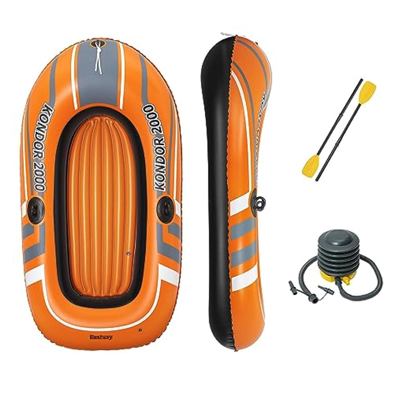 Bestway Kondor 2000Dieses Schlauchboot besitzt drei Luftkammern mit Schraubventilen für das schnelle Ein- und Auslassen der Luft. Der Boden ist für Extra-Komfort aufblasbar. Das Boot verfügt über ein umlaufendes Seil zum Festhalten. Im Lieferumfang enthalten sind zudem zwei Paddel, ein kleiner Blasebalg und ein Reparatur-Kit.Das Boot ist für 1 Person geeignet und bis maximal 120 kg belastbar. Achtung! Nicht geeignet für Kinder unter 3 Jahren! Achtung! Benutzung nur unter unmittelbarer Aufsicht durch Erwachsene! Achtung! Nur im flachen Wasser verwenden!