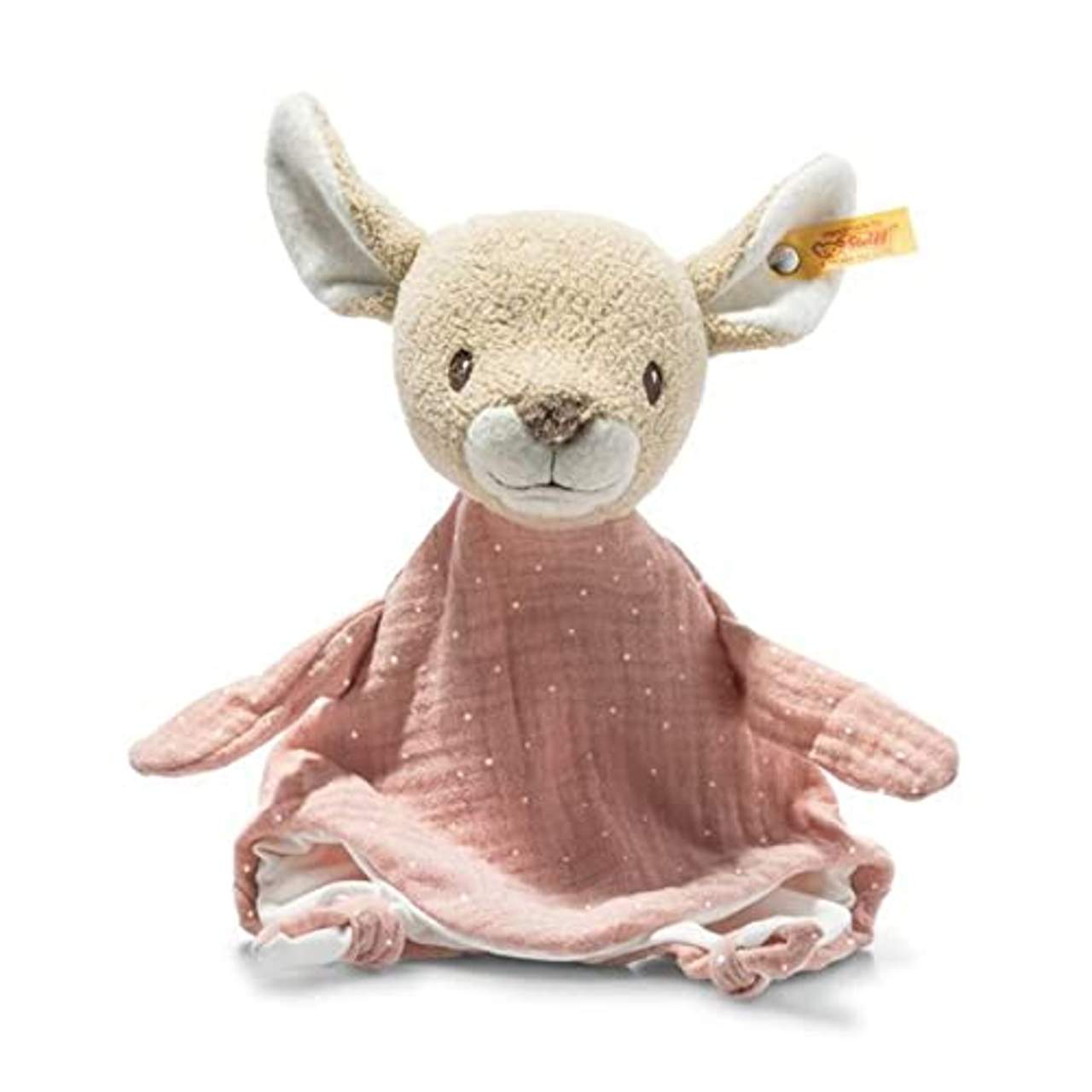 Steiff 242427 Gots Raja REH SchmusetuchSooo zärtlich… Als Steiff Schmusetuch kuschelt sich GOTS Raja Reh ganz sanft in die Welt kleiner Babys! Sie ist mal Fingerpuppe, dann wieder treue Freundin. Sie streichelt euch über die Wange, stippst euch an die Stirn, dient als Versteck für kleine Hände und Füße.Und es gibt viel zu entdecken: Da sind hübsch geformte Rehohren – eines mit „Knopf im Ohr“, dazu feiner und wuscheliger Plüsch, runde Augen und eine dreieckige Nase. Als fürsorgliches kleines Rehmädchen ist Raja gefüllt mit recycelten PET-Flaschen und Bio-Baumwolle; ihr Plüsch und das Musselintuch sind aus feinster, zertifizierter 100% Bio-Baumwolle (GOTS).Das 30 cm große Raja Reh Schmusetuch begleitet euch im Kinderwagen, beim Schlafen und Spielen. Es kombiniert Zartes und Fröhliches – Rosa, Beige und Weiß, außen gepunktet, innen gestreift. Und die Knoten im Tuch eignen sich prima zum Greifen und Nuckeln!