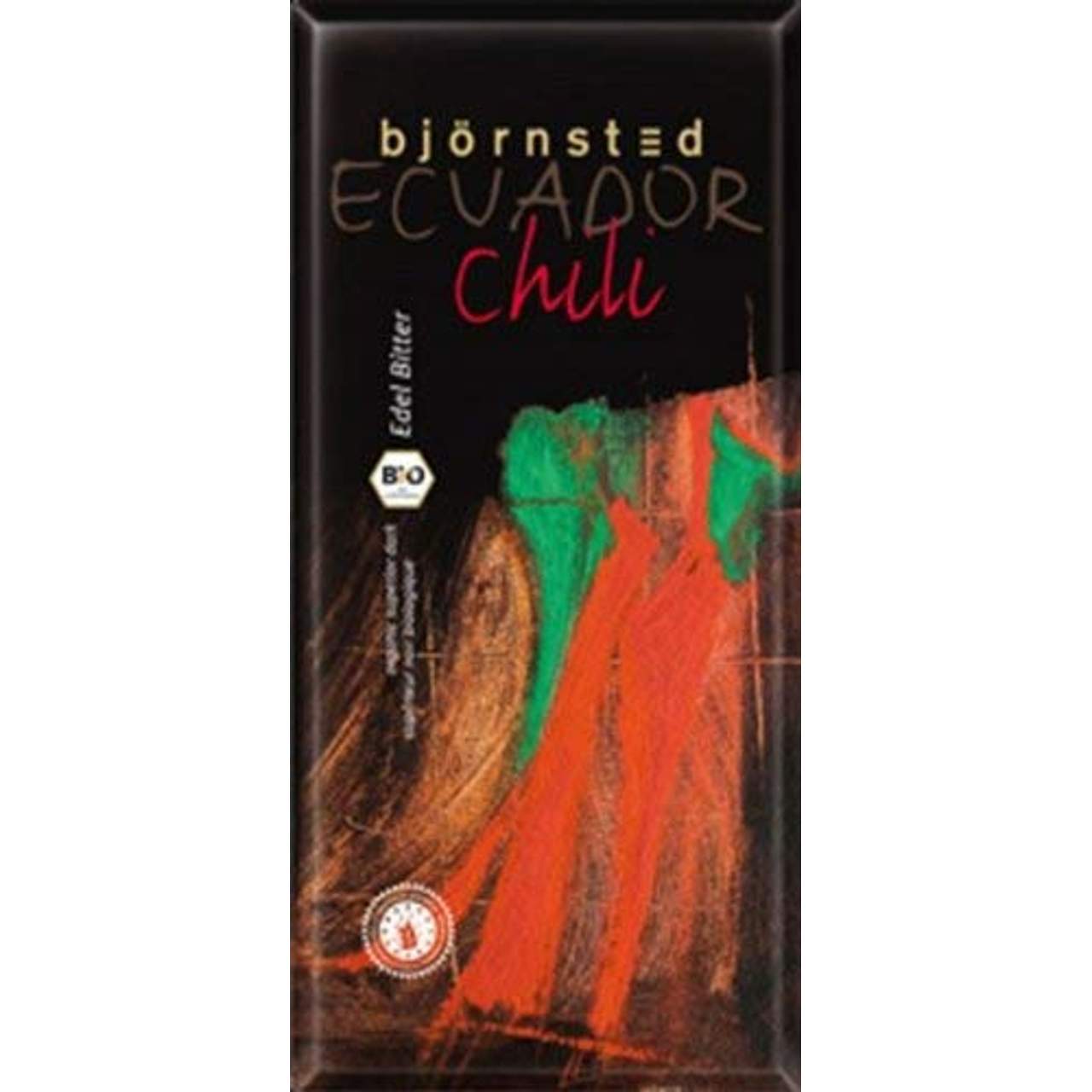 Björnsted Bio Chili Edel Bitter Schokolade ist eine Marke von Bremer-Gewürzhandel Genuss leben Bio-Bitterschokolade mit Chili. Sie enthält Kakaomasse, Rohrohrzucker, Kakaobutter und Chili als Zutaten, mit mindestens 70% Kakaoanteil. Sie ist biologisch, ohne Konservierungsstoffe, Emulgatoren, künstliche Aromen oder Gentechnik. Das Unternehmen spendet von jedem Verkauf 1 Cent an eine Wohltätigkeitsorganisation und versendet ab einem Bestellwert von 50 Euro auch kostenlos.