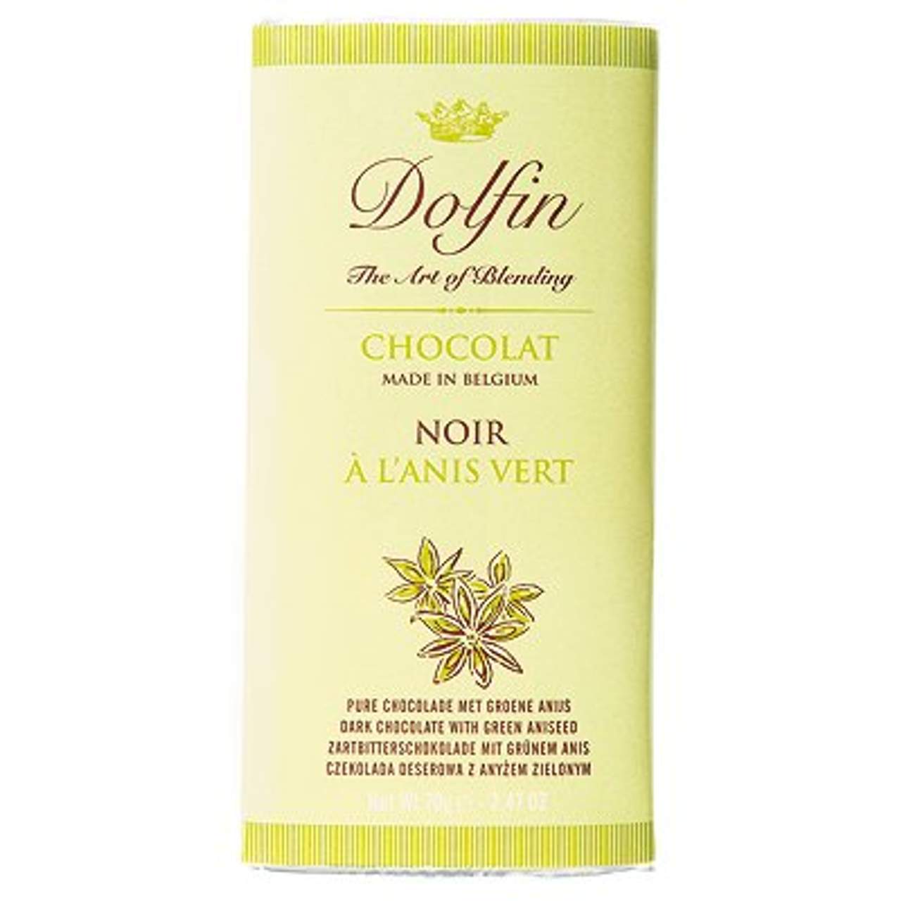 Dolfin Zartbitterschokolade mit grünem Anis ist eine belgische Zartbitterschokolade der Marke Dolfin. Sie wird in 70g-Tafeln geliefert und enthält 51% Kakao. Der einzigartige Geschmack dieser Schokolade ist süßer und zarter Anis, gemischt mit den bitteren Tönen der Schokolade. Sie enthält keine künstlichen Aromastoffe. Andere Geschmacksrichtungen von Dolfin sind Birne & gebrannte Mandeln und rosa Pfeffer.