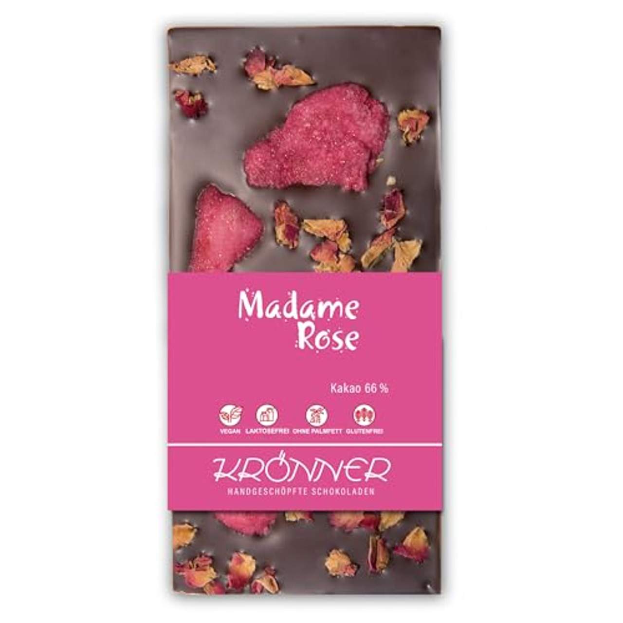 Krönner Madame Rose Zartbitter Schokolade ist eine Zartbitterschokolade der Marke Krönner vom Chocolatier KRÖNNER in Garmisch-Partenkirchen. Sie wird in einer 110 g-Tafel geliefert und hat einen Kakaoanteil von 66%. Die Schokolade besteht aus handgeschöpften Stücken mit kandierten Rosenblättern, die ihr einen einzigartigen Geschmack verleihen. Die vier Hauptmerkmale sind: Marke, Gewicht, Kakaogehalt und Geschmack.
