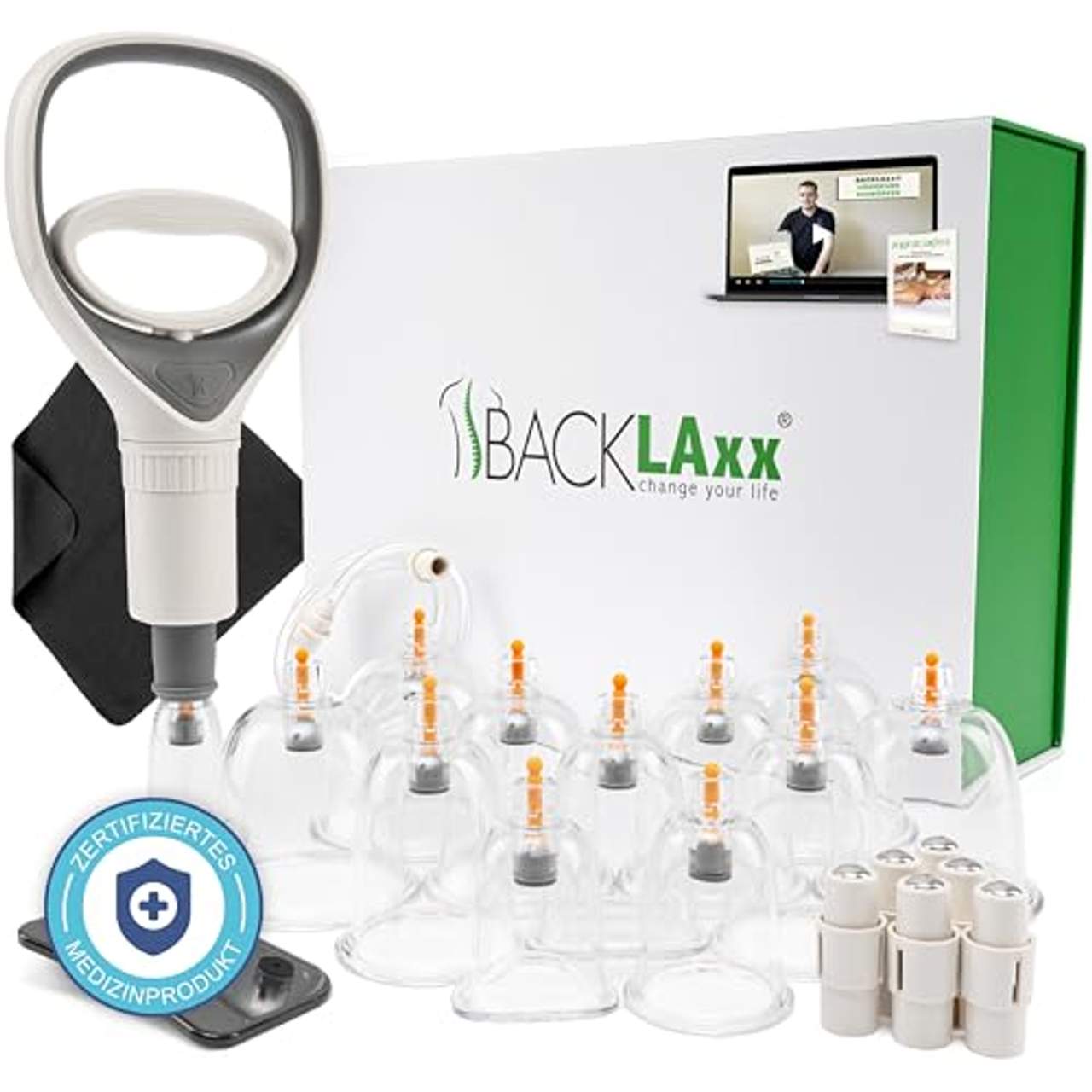 BACKLAxx Schröpfgläser mit VakuumpumpeLIEFERUMFANG Lass Dich von einem der umfangreichsten Schröpfsets auf dem Markt überzeugen: 1x Langlebige Vakuumpumpe 12x Schröpfglocken aus hygienischem Kunststoff 1x Schlauch zur Verlängerung 1x Faszienschaber 1x Mikrofasertuch 6x Therapiemagnete Gratis Download: 1x Videokurs mit Anwendungsbeispielen 1x eBook zum Thema Schröpfen mit Anwendungsbeispielen (44 Seiten) 1x eBook zum Thema Triggerpunktbehandlung (66 Seiten) MAßE In unserem Set findest Du eine gezielte Auswahl an Schröpfglocken in verschiedenen Größen, die Dir eine möglichst umfassende Schröpftherapie ermöglichen.2x 8,5 cm 2x 6,5 cm 2x 5,0 cm 2x 4,2 cm 1x 3,5 cm 1x 2,5 cm 1x 4,2 cm (gewölbt) 1x 3,5 cm (gewölbt) Die Maßangaben entsprechen dem inneren Durchmesser der Schröpfglocken. UNSERE VISION Eine Welt mit mehr Gesundheit, Wohlbefinden und Entspannung. Wir bei BACKLAxx möchten durch nachhaltige Produkte allen ein vitales und ausgeglichenes Leben ermöglichen. In den Bereichen Akupressur, Yoga, Meditation, Faszien und Schröpfen vertrauen über 40.000 Kundinnen und Kunden weltweit auf uns.Das Produktsortiment besteht weitestgehend aus nachwachsenden Rohstoffen wie bspw. Kokosfaser, Kork, Naturkautschuk oder Kapokfaser. Auch bei der Verpackung achten wir auf nachhaltige Alternativen zu herkömmlichen Kartonagen oder Plastikverpackungen. Der Großteil unserer Produkte ist in einer biologisch abbaubaren Tasche aus Maisstärke verpackt und wird in einem Karton aus Recyclingmaterial versendet.