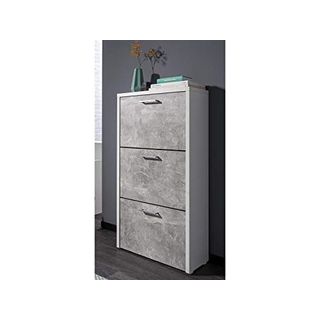Eines der Highlights des „Schuhkipper Schuhaufbewahrung Schuhkommode Schuhständer“ ist seine trendige Farbgestaltung. Sie zeichnet sich durch eine stilvolle Kombination aus klarem Weiß für den Korpus und einer Frontplatte mit einer modernen, strukturierten Betonimitation aus. Diese realistische Betonoptik wertet das Gesamtbild des Schuhschranks auf und passt zu jedem Einrichtungsstil. Außerdem verleihen die alufarbenen Griffe dem Schrank einen Hauch von Eleganz.