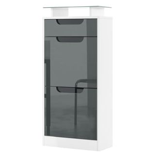 Der Vladon Schuhschrank Schuhkipper Fiesta ist ein Schuhschrank, der sowohl Funktionalität als auch Stil bietet. Er verfügt über zwei Klappen und eine Schublade und bietet damit reichlich Stauraum für deine Schuhe und andere Accessoires wie Schlüssel oder wichtige Dokumente. Das Gesamtdesign des Schranks ist schlicht und modern, mit einem mattschwarzen Korpus und hochglänzenden grauen MDF-Fronten.