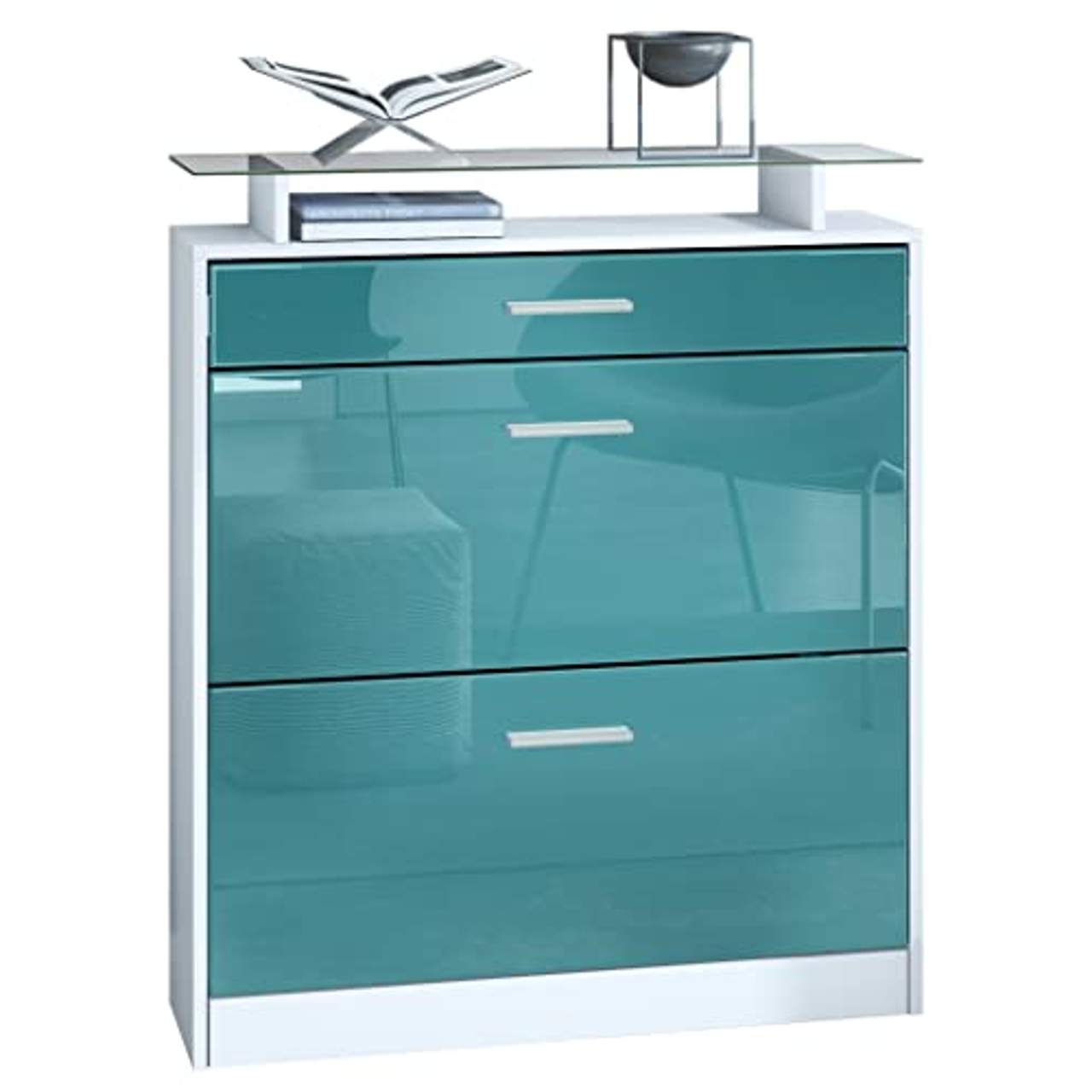 - Stil: Der Schuhschrank hat einen modernen, stilvollen Look mit einem mattweißen Korpus, petrolfarbenen Hochglanz-MDF-Fronten, abgerundeten Kanten und silberfarbenen Kunststoffgriffen. Er kann auch mit einer LED-Glaskantenbeleuchtung ausgestattet werden, um seine Ästhetik noch weiter zu verbessern.
