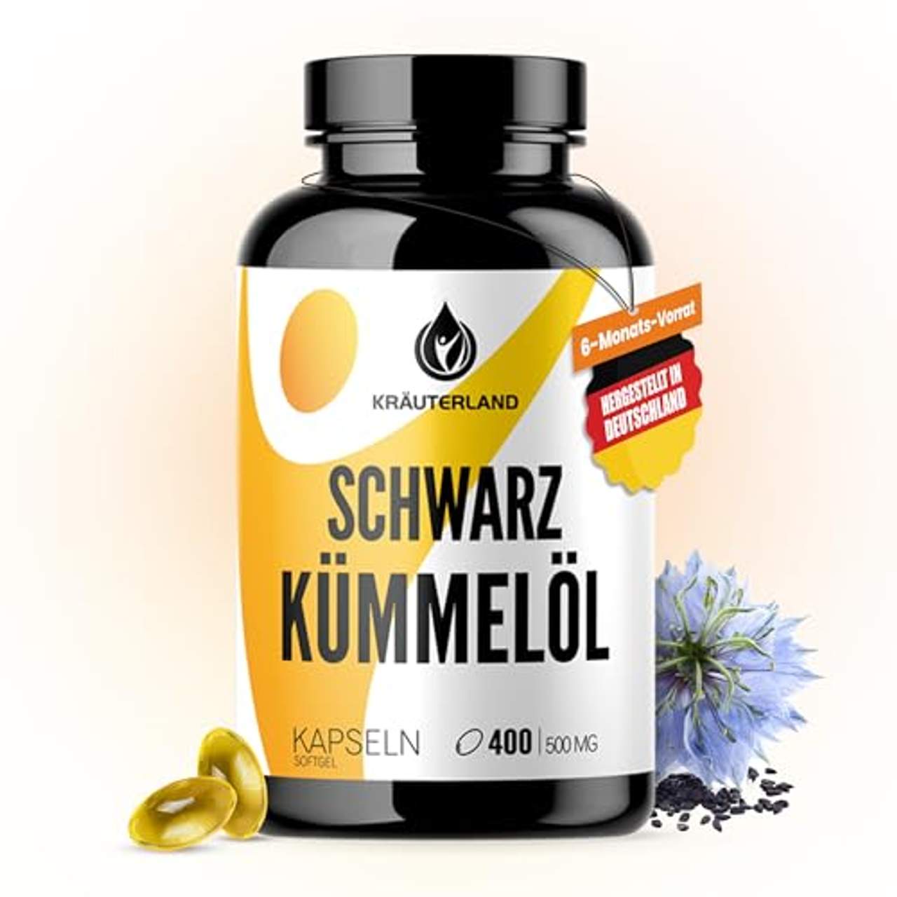 - Kräuterland 400 Schwarzkümmelöl Kapseln hochdosiertca. 23 €0,06 €/StückGratis Premiumversand mit Amazon Prime