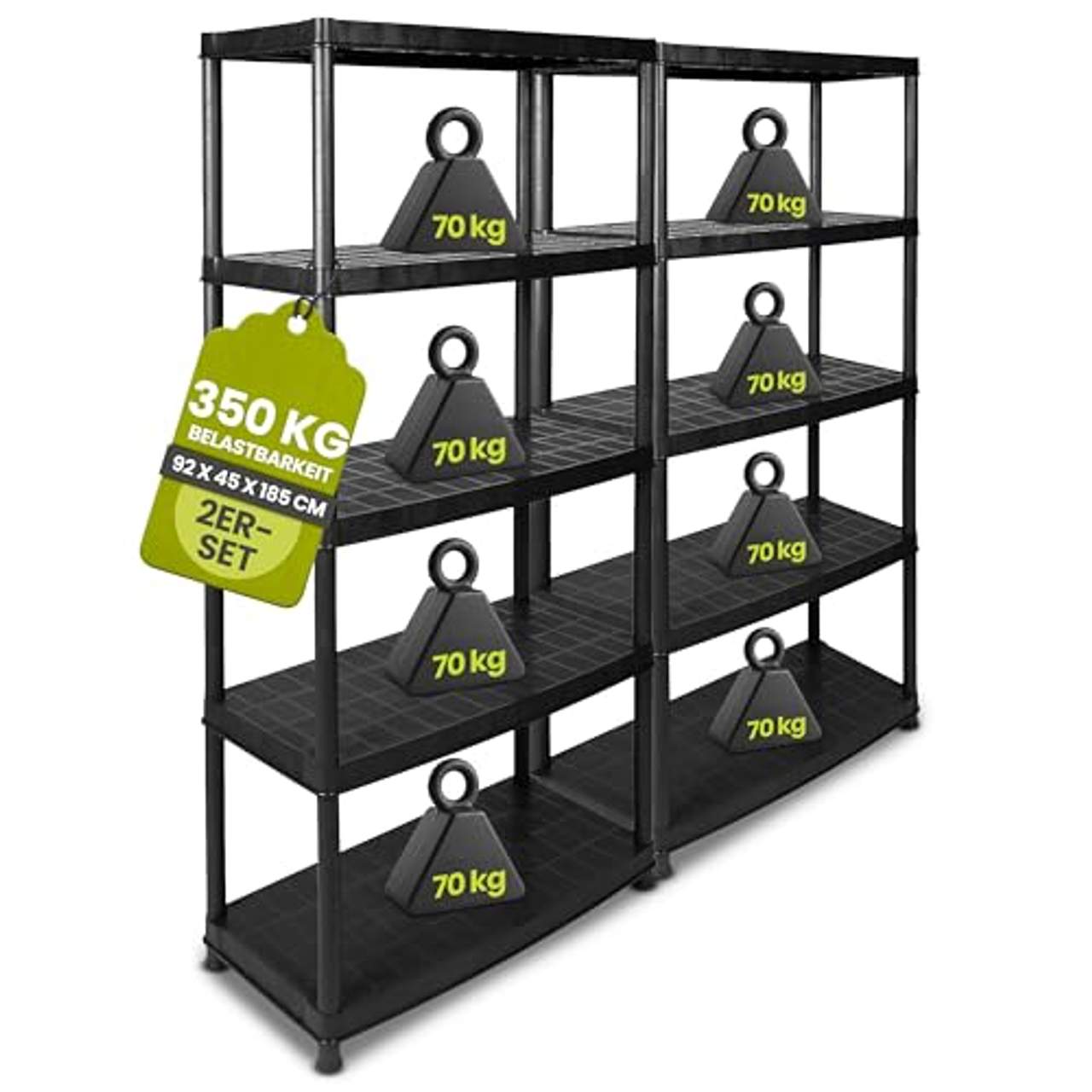 Bei diesem Produkt handelt es sich um ein Schwerlastregal namens „2 Stück XXL Kunststoffregal Schwerlastregal“ der Marke „Kreher“. Es besteht aus zwei Teilen und hat jeweils fünf stabile Fachböden. Jedes Regal kann bis zu 70 kg tragen, mit einer Gesamtbelastbarkeit von 350 kg pro Regal, wenn die Last gleichmäßig verteilt ist. Das Produkt ist aus recyceltem Polypropylen hergestellt und wird mit Wandhalterungen für die Montage und Verbindungsstücken für die Erweiterung geliefert. Es ist abwaschbar, robust und TÜV-geprüft.