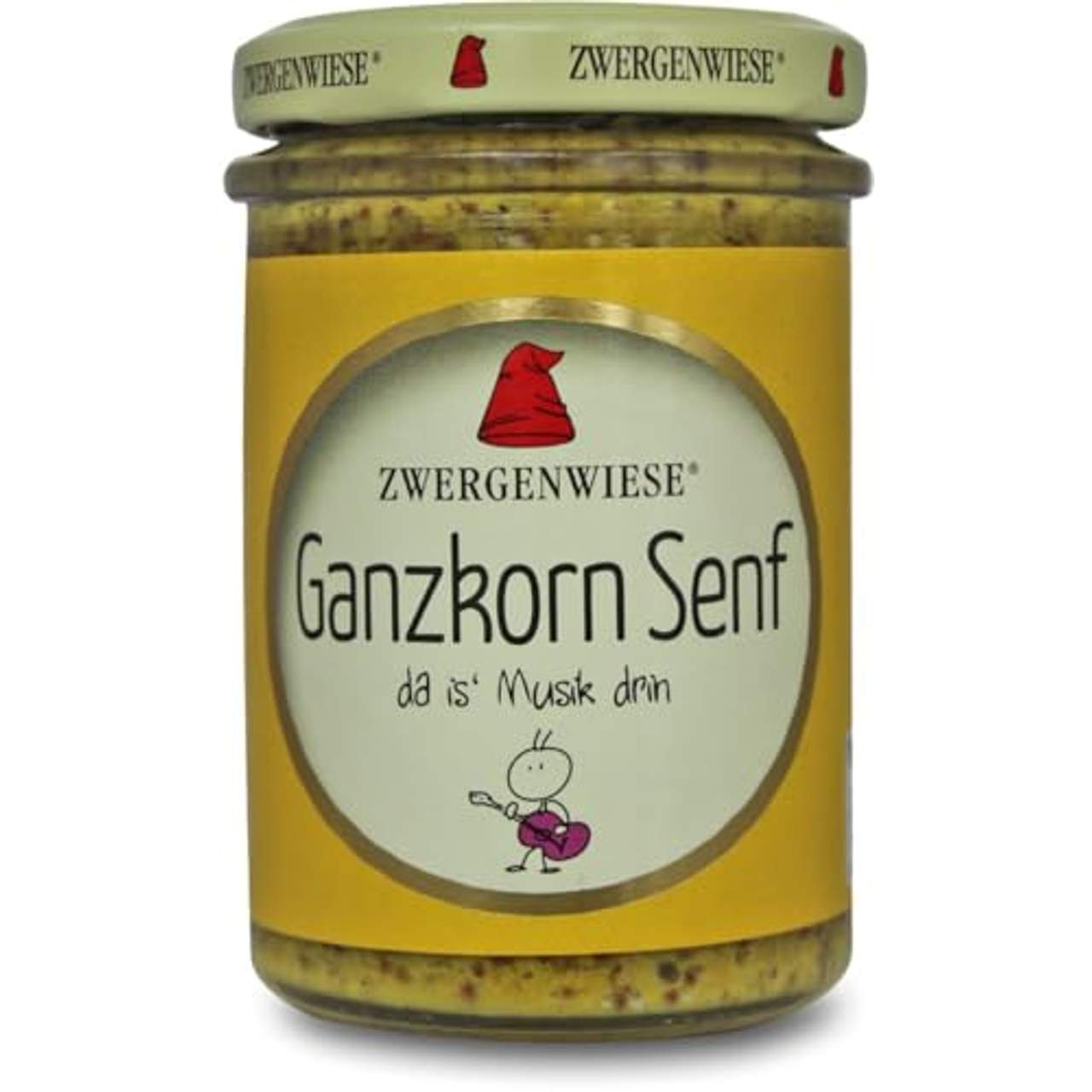 Zwergenwiese Bio Ganzkorn Senf ist eine Marke für Bio-Vollkornsenf. Er wird aus 100 % Bio-Senfsaat aus Deutschland hergestellt und enthält keinen Zuckerzusatz, wodurch er vegan und glutenfrei ist. Der Senf enthält Aromastoffe wie Nelken, Ingwer und Kurkuma, die den Geschmack verstärken. Er kann zum Kochen oder zur Herstellung von Chutneys und Dressings verwendet werden.