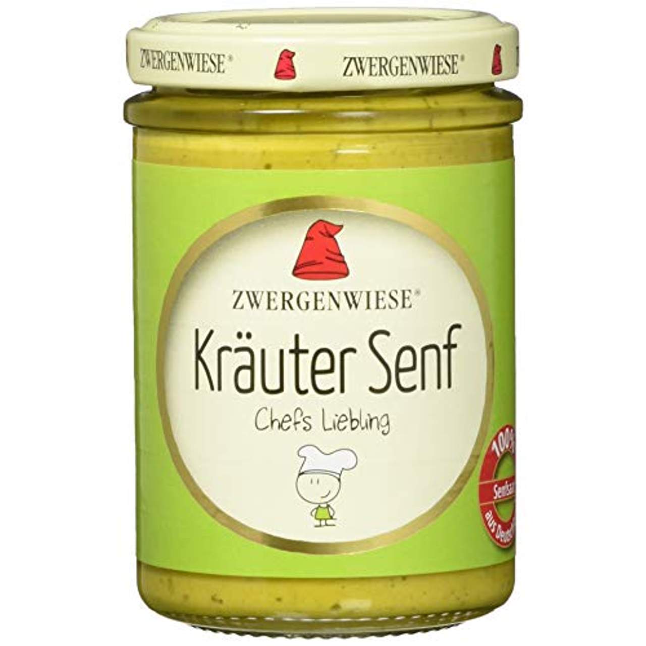 Zwergenwiese Bio Kräuter SenfDer „“„„Würzige““„“ von Zwergenwiese Der Kräuter-Senf von Zwergenwiese ist die ideale Option für alle, die ihren Senf etwas würziger und abwechslungsreicher mögen. Die bewährte Senfrezeptur von Zwergenwiese (ausgewählte Senfsaaten aus deutschem Bio-Anbau, Nuancen von Kurkuma, Nelke und Ingwer) wird hier mit fein-würzigen Kräutern der Provence ergänzt, die diesem Senf das besondere Etwas verleihen.Alle Zutaten stammen aus kontrolliert biologischem Anbau, unerwünschte Zusatz- oder Geschmacksstoffe kommen nicht zum Einsatz. Der Kräuter-Senf passt hervorragend zu Gegrilltem, Eiern oder Käse. Auch in extrawürzigen Dressings und Senfsaucen macht er eine gute Figur! Zutaten: Wasser, Apfelessig*, SENFkörner*, Steinsalz, Kräuter der Provence*, Nelke*, Ingwer*, Kurkuma*. „“