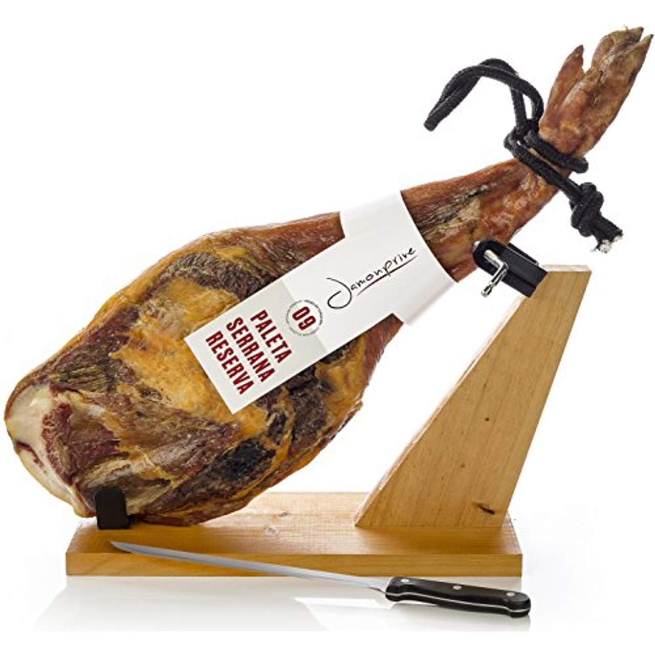 Dieses Produkt ist ein „Serrano Schinken Reserva Halbentbeint“ der Marke „Jamonprive“. Er wurde halbentbeint, das heißt, der große Schulterblattknochen wurde entfernt. Der Reifungsprozess dauert mindestens 9 Monate und findet in den Gebirgszügen der Sierras statt, wo niedrige Temperaturen die Reifung begünstigen. Es handelt sich um einen halbfetten Serrano-Schulterschinken mit mittlerer oder hoher Reifung.