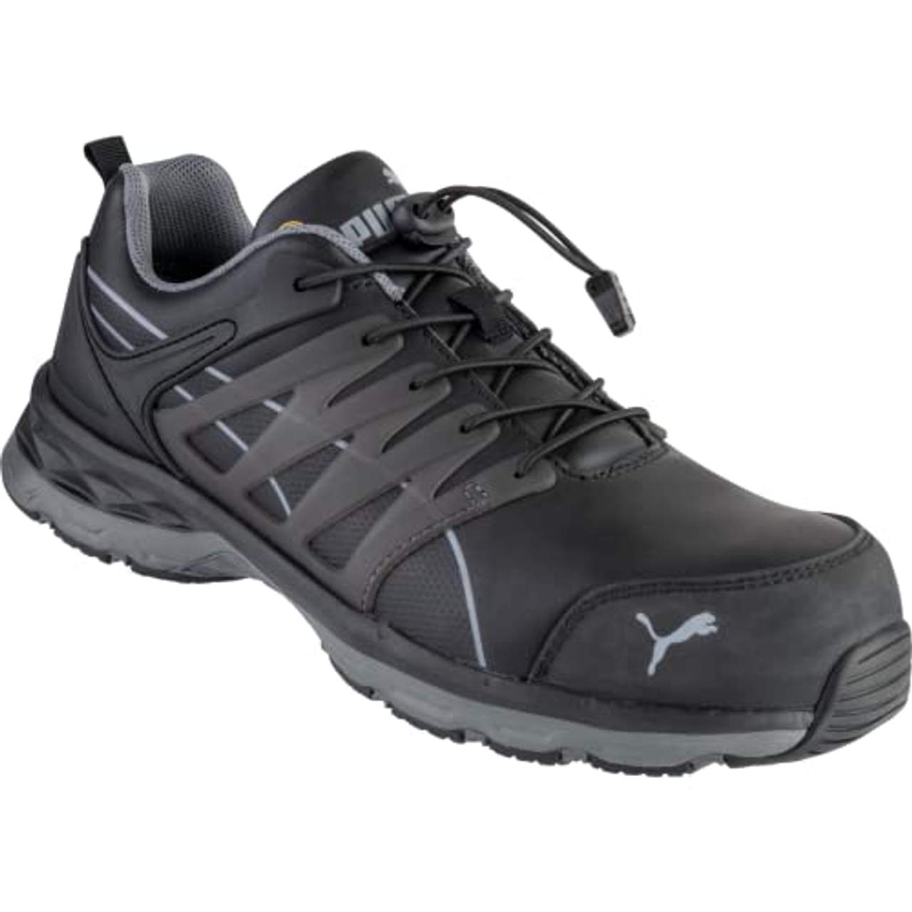 PUMA Velocity 2.0 Sicherheitsschuh S3 ESD HRO SRCSchutz: Fiberglaskappe, metallfreier, flexibler FAP-DurchtrittschutzSchaft: hochwertiges, glattes Vollrindleder mit TPU-VerstärkungenPlus: metallfrei, ESD, Vorderkappen- und Fersenschutz, Zusatzpaar Kordelschnürsenkel im Karton, Schnellschnür-SystemFußbett: evercushion BAFutter: BreathActive FunktionsfutterSohle: MOTION IMPULSE - 300C hitzebeständige, rutschfeste Gummilaufsohle mit Zwischensohle aus IMPULSE.FOAM in zwei unterschiedlichen Dichten für hervorragende Dämpfung, Stabilität und KomfortGröße/Weite: 39 - 48 / 11 Mit der nächsten Generation der MOTION PROTECT Linie hat PUMA SAFETY wieder genau den Puls der Zeit getroffen. Hinter der design-award verdächtigen Optik verbirgt sich ein ganzes Powerpaket an innovativer Ausstattung und Komfort.Durch die außergewöhnliche Sohlenkonstruktion mit einer zweifachgeschäumten Mittelsohle aus IMPULSE.FOAM in unterschiedlichen Dichten ist der VELOCITY 2.0 BLACK LOW für lange Arbeitstage mit viel Stehen und Laufen hervorragend geeignet.Dabei fängt der IMPULSE.FOAM der Zwischensohle nicht nur die Aufprallkräfte ab, sondern gibt gleichzeitig bis zu 55% der Energie aktiv an den Träger zurück.Die bis zu 300C hitzebeständige, rutschfeste Gummilaufsohle (HRO, SRC) gibt bei jedem Schritt Sicherheit und ist zudem äußerst strapazierfähig.Dank dem evercusion BA Fußbett wird der Fuß in seiner natürlichen Abrollbewegung unterstützt.Der hoch atmungsaktive evercushion Schaumstoff transportiert Schweiß ab und sorgt für ein angenehmes Mikroklima im Schuh. Die anatomische Form mit Längsgewölbeunterstützung schützt Gelenke und Bänder vor Verletzungen.Außerdem ist der VELOCTIY 2.0 BLACK LOW mit einem elastischen Schnellschnür-System ausgestattet.So braucht sich der Träger um die perfekte Schuhbindung und um offene Schuhbänder keine Gedanken mehr zu machen. Zusätzlich liegen jedem Schuhkarton ein Paar konventionelle Schnürsenkel bei.