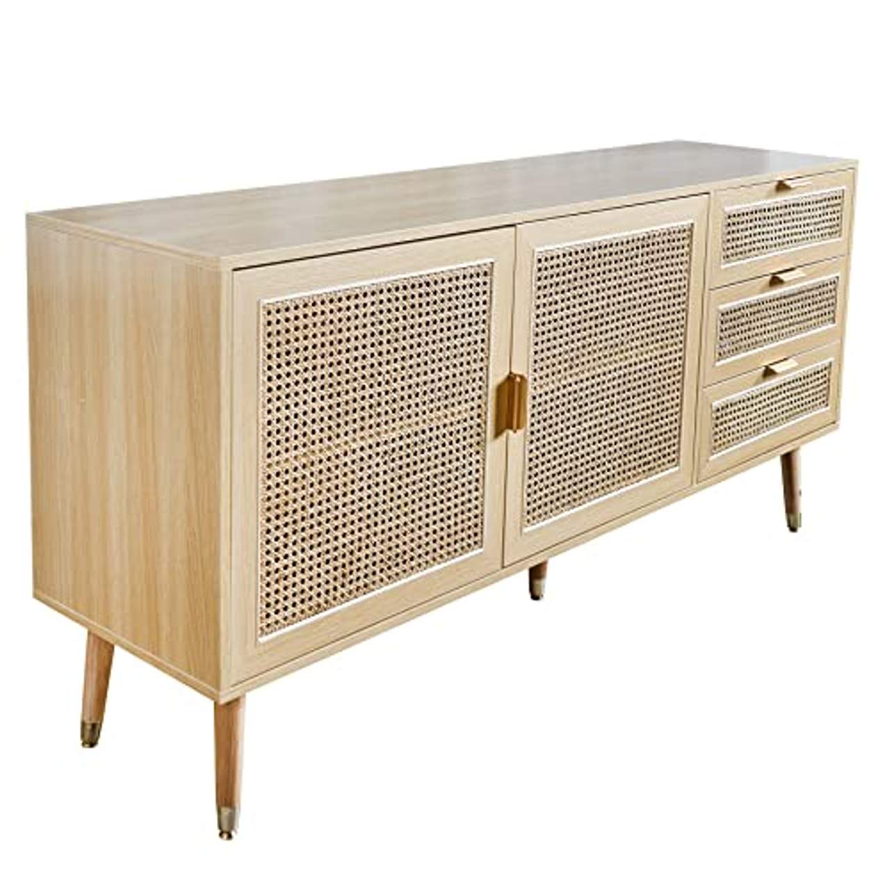 Der Korpus des Sideboards besteht aus MDF (mitteldichte Faserplatte) mit einer 3D-Melaminharzbeschichtung für Langlebigkeit und Verschleißfestigkeit. Die Füße sind aus Gummibaumholz mit Metallverzierung und die Griffe sind aus Metall mit Messingeffekt gefertigt.