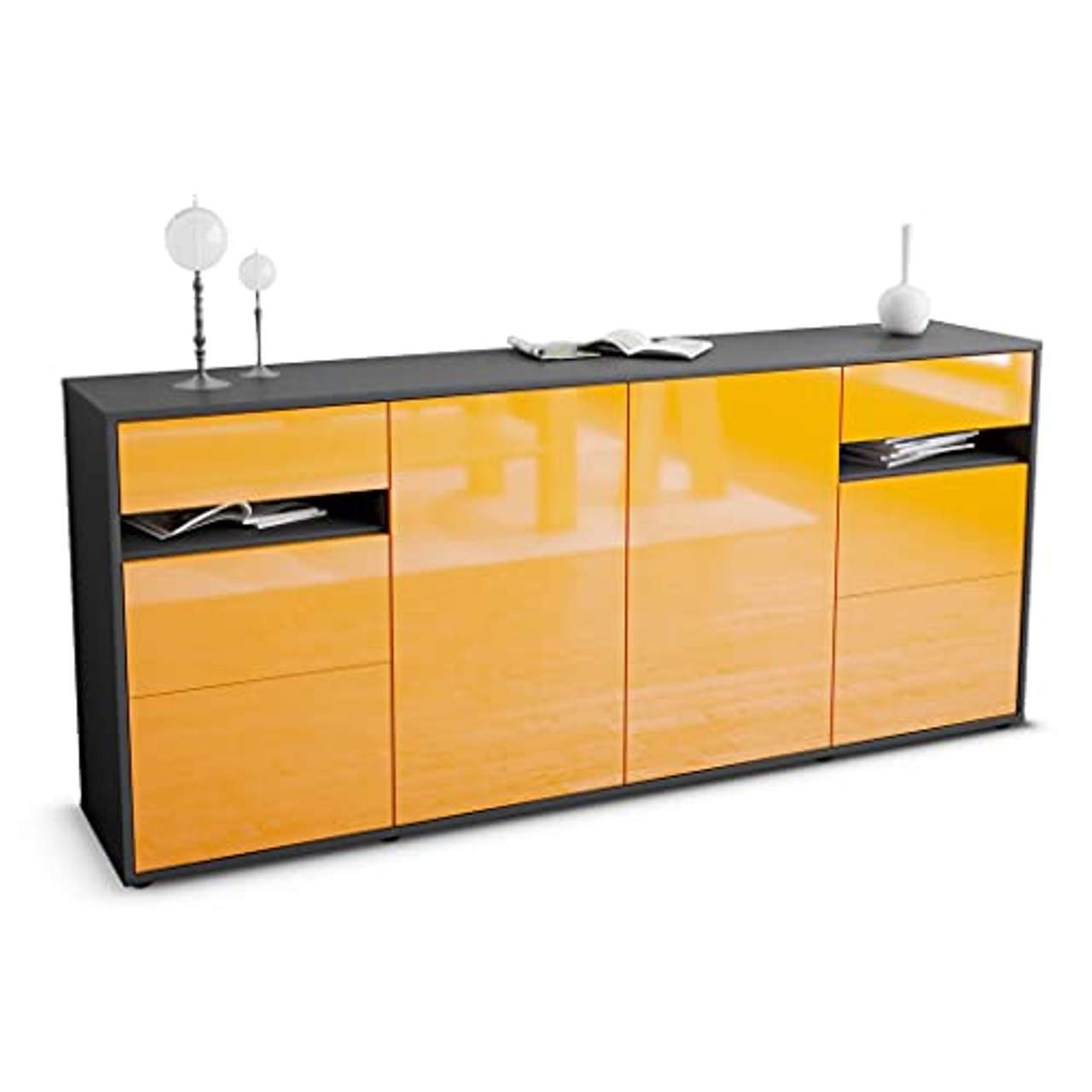 - Moderne Ästhetik: Das Sideboard zeichnet sich durch eine moderne Ästhetik aus. Der matte anthrazitfarbene Korpus und die hochglänzende mandarinenfarbene Front verleihen ihm einen stilvollen Look, der zu jeder modernen Einrichtung passt.