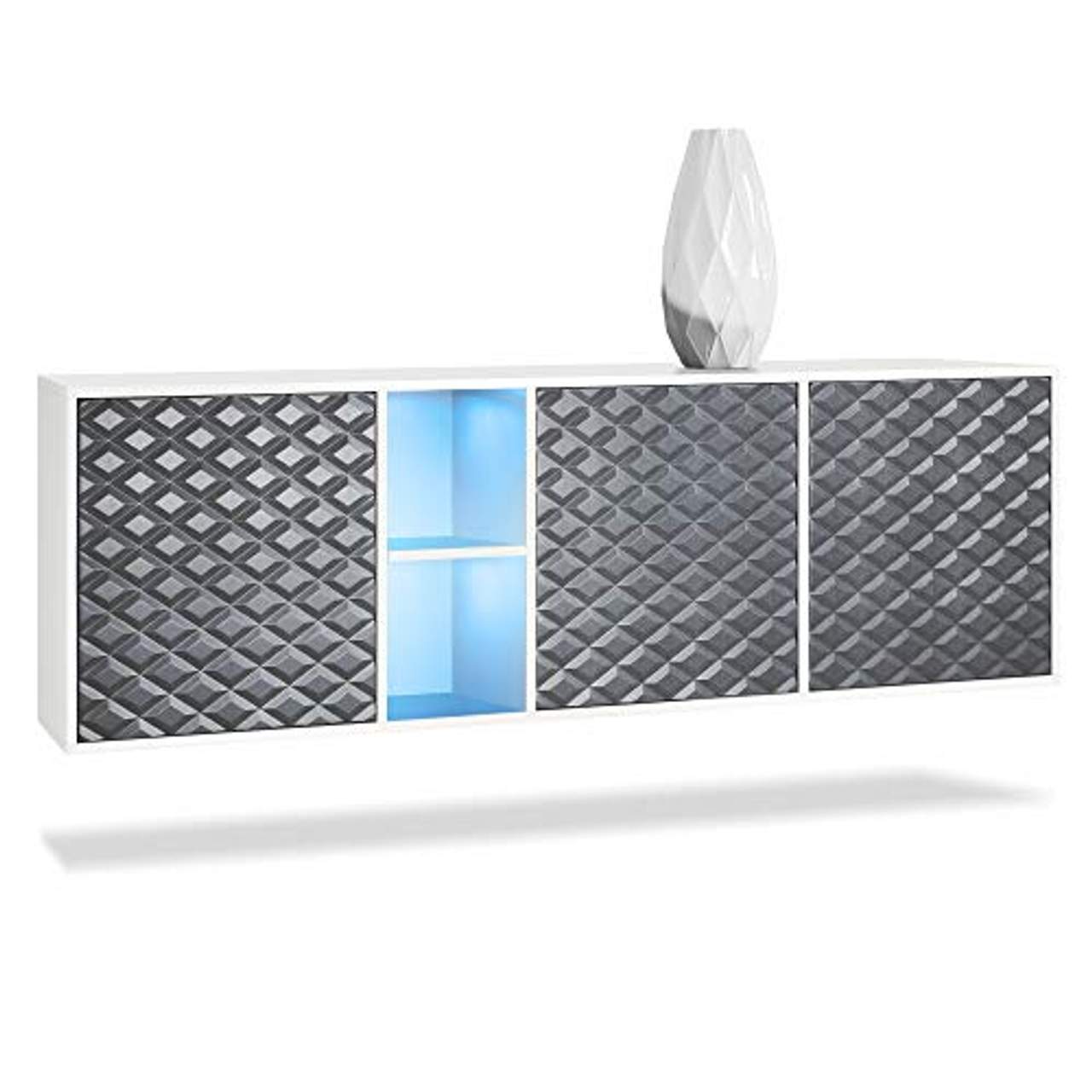 - Hohe Qualität: Dieses Sideboard ist aus hochwertigen Materialien wie MDF für die Türen und weiß matt für den Korpus (Oberseite, Seiten und Einlegeböden) gefertigt. Außerdem verfügt es über Softclose-Scharniere und LED-Beleuchtung in RGB (Multicolor) mit Fernbedienung.