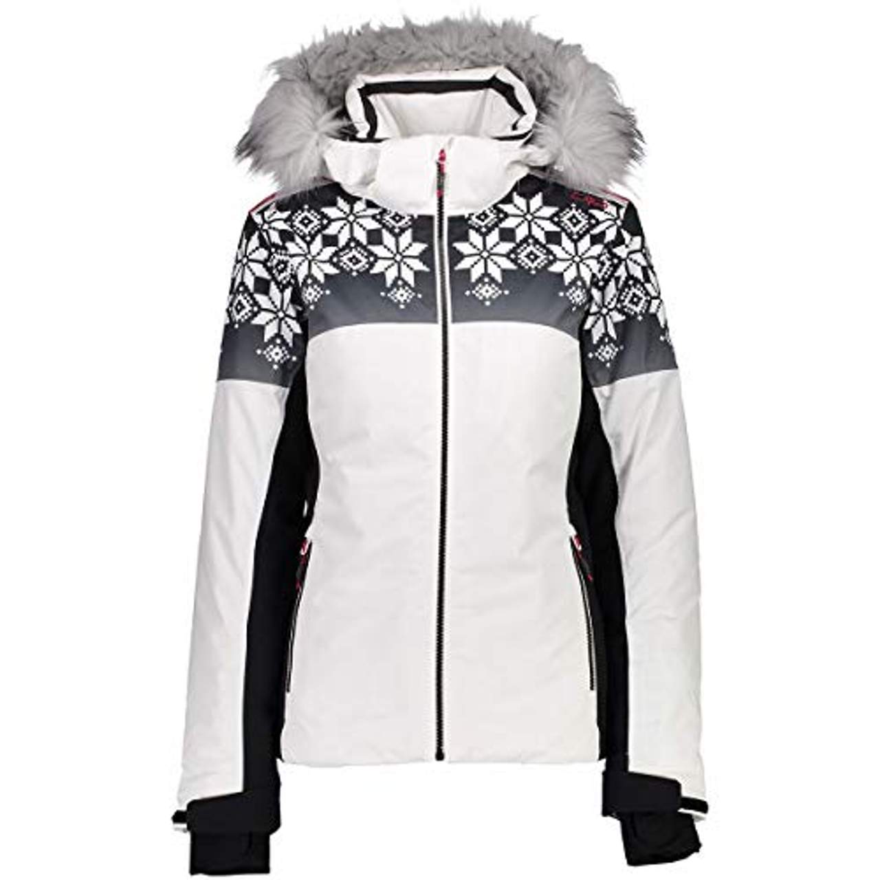 Die CMP Damen Skijacke Jacke hat ein sportliches Design mit einer leicht taillierten Schnittform. Sie hat ein schickes Muster auf Schulterhöhe und eine abnehmbare Kapuze mit einem wärmenden Webpelzbesatz, was ihr auf und abseits der Piste einen modischen Look verleiht.